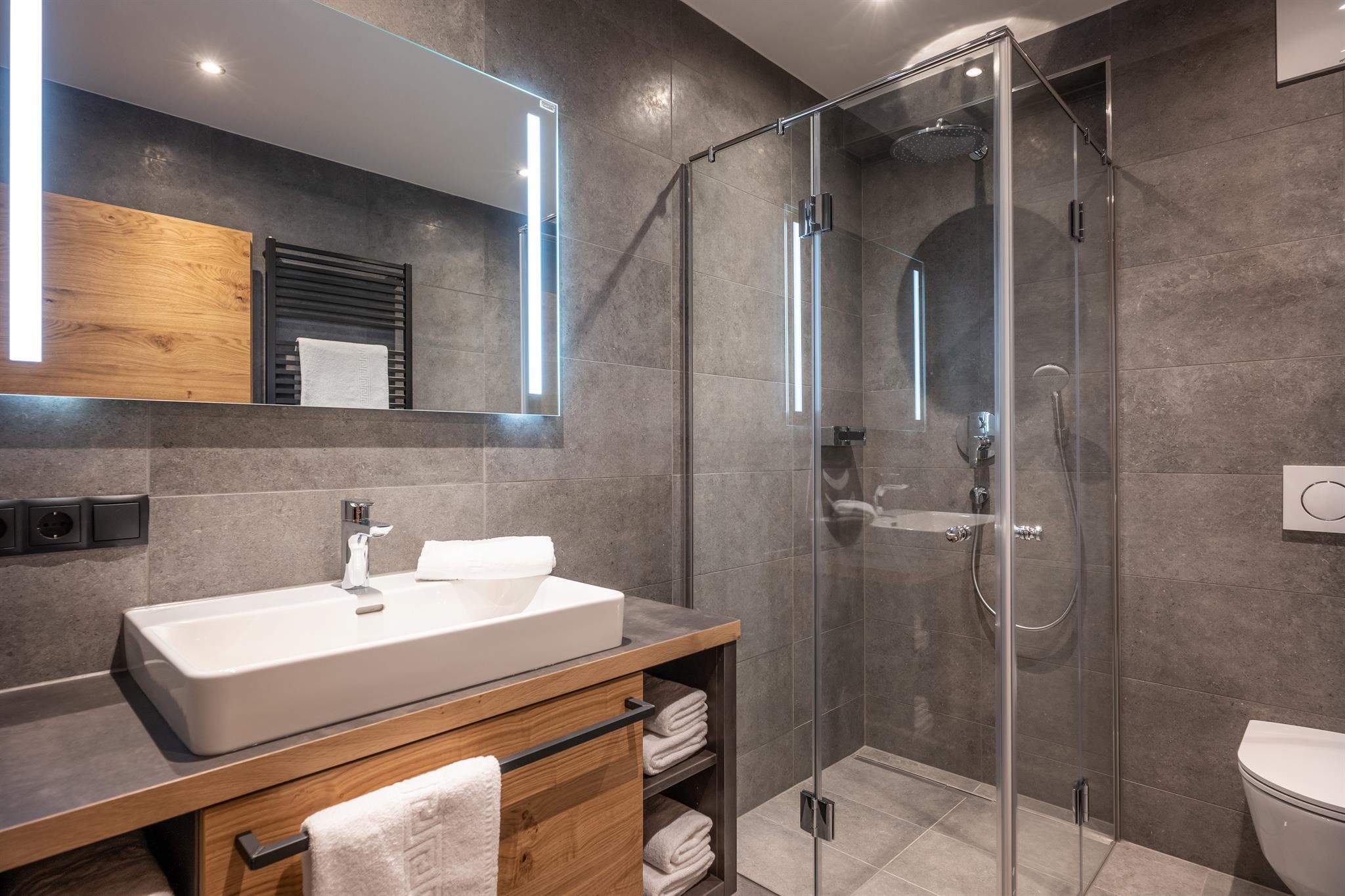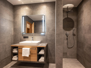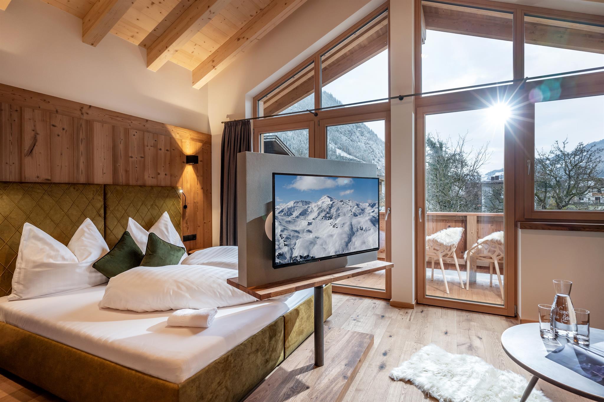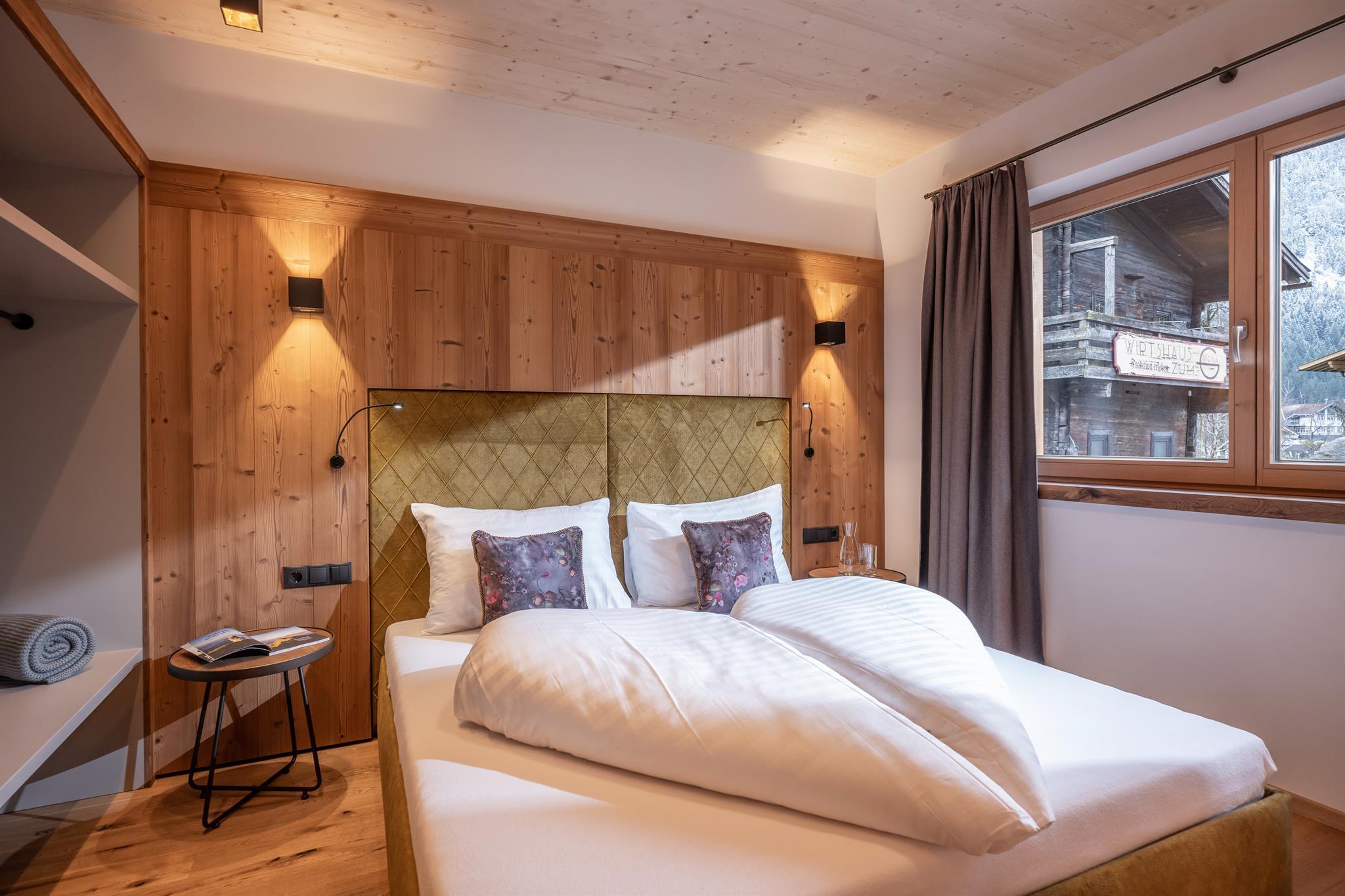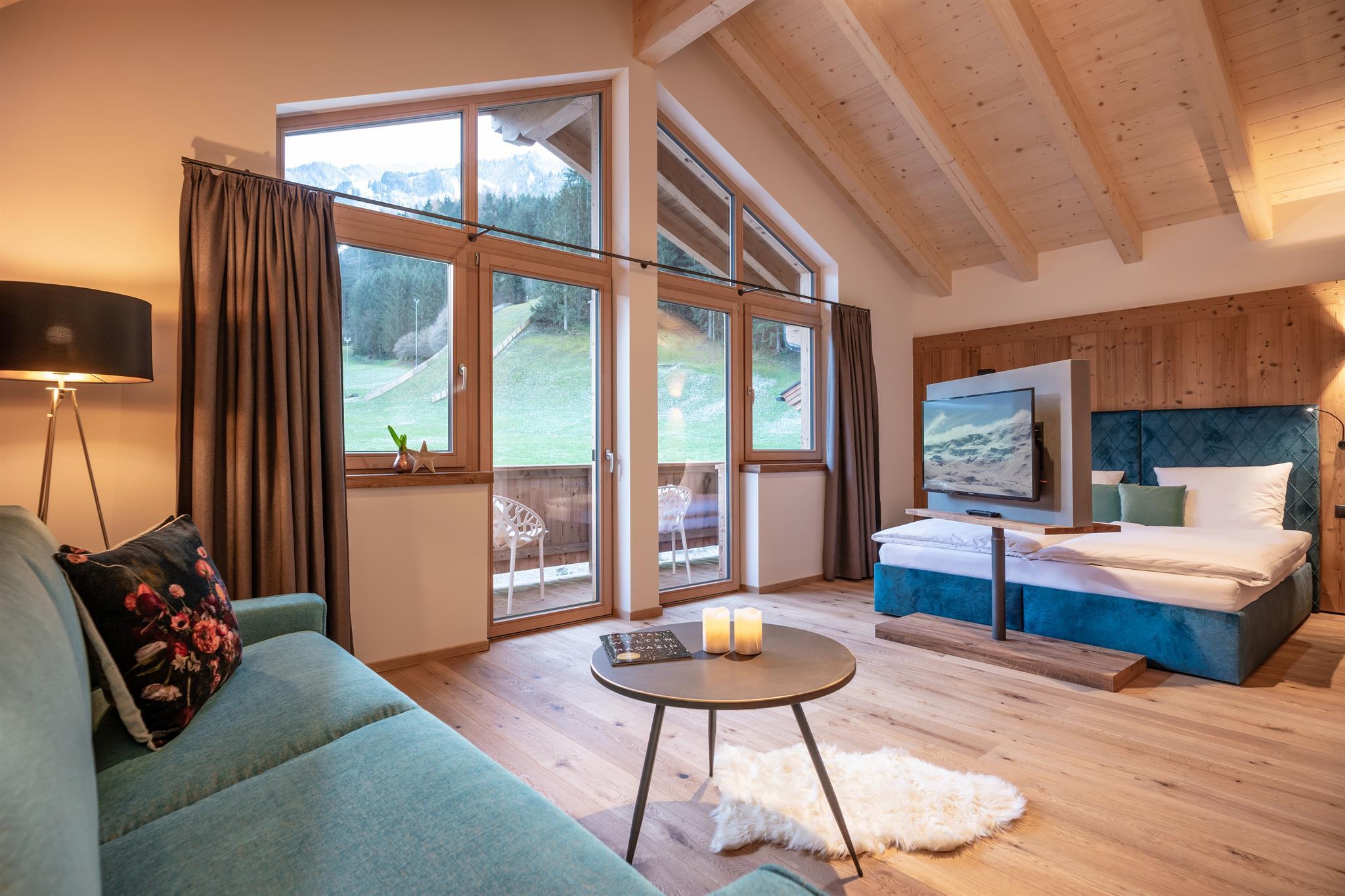 132m² für 8-10 Personen - geräumige Garderobe mit Sitzgelegenheit - 3 stilvolle Schlafzimmer mit hochwertigen Boxspring-Doppelbetten - zusätzlich 1 Panorama Schlafzimmer-Suite mit Ahornblick - vollausgestattete moderne Küche - gemütlicher Wohnraum
