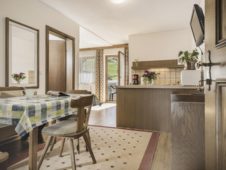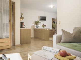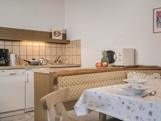Unser Apartment Margit bietet Platz für 4 Personen und besteht aus einem Schlafzimmer mit einem King-Size Bett und einem Wohnraum mit einer gemütlichen Schlafcouch. Dusche mit WC ist abschließbar. Essecke mit Tisch und Stühlen, Kochnische mit einem 2er