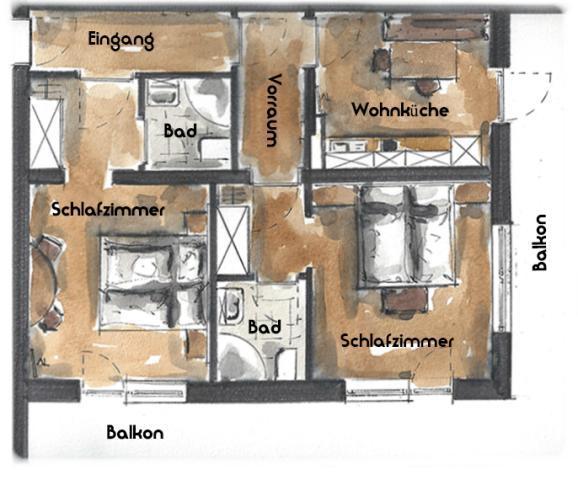 Gemütliches Apartment für 4 Personen - Wohnküche mit Sat/TV Balkon - 1 Schlafzimmer mit DU/Wc Balkon - 1 Schlafzimmer mit mit DU/Wc Balkon ...wird das Apartment für 2 Personen gebucht - ist nur ein Schlafzimmer verfügbar - in der Hauptsaison von
