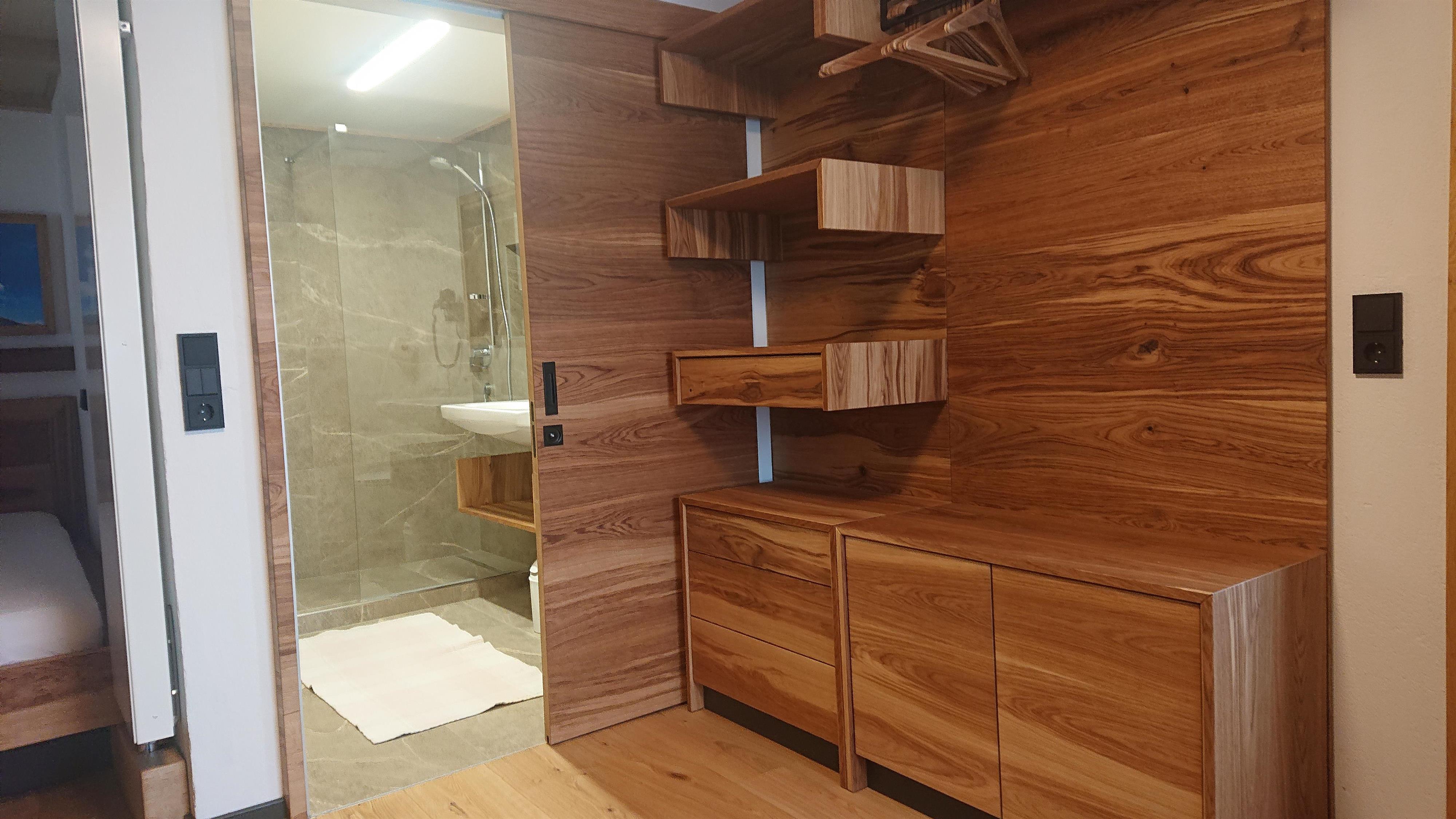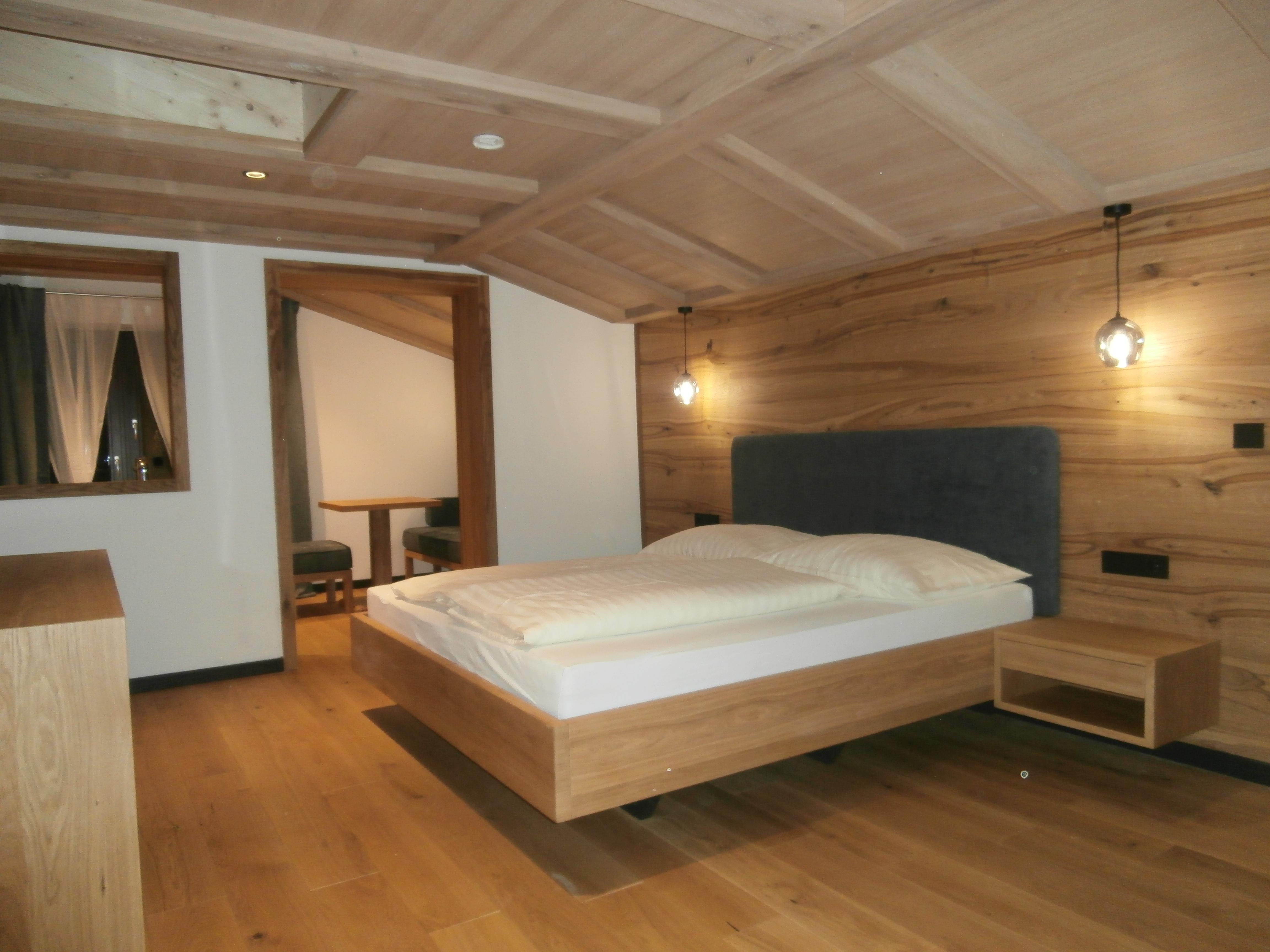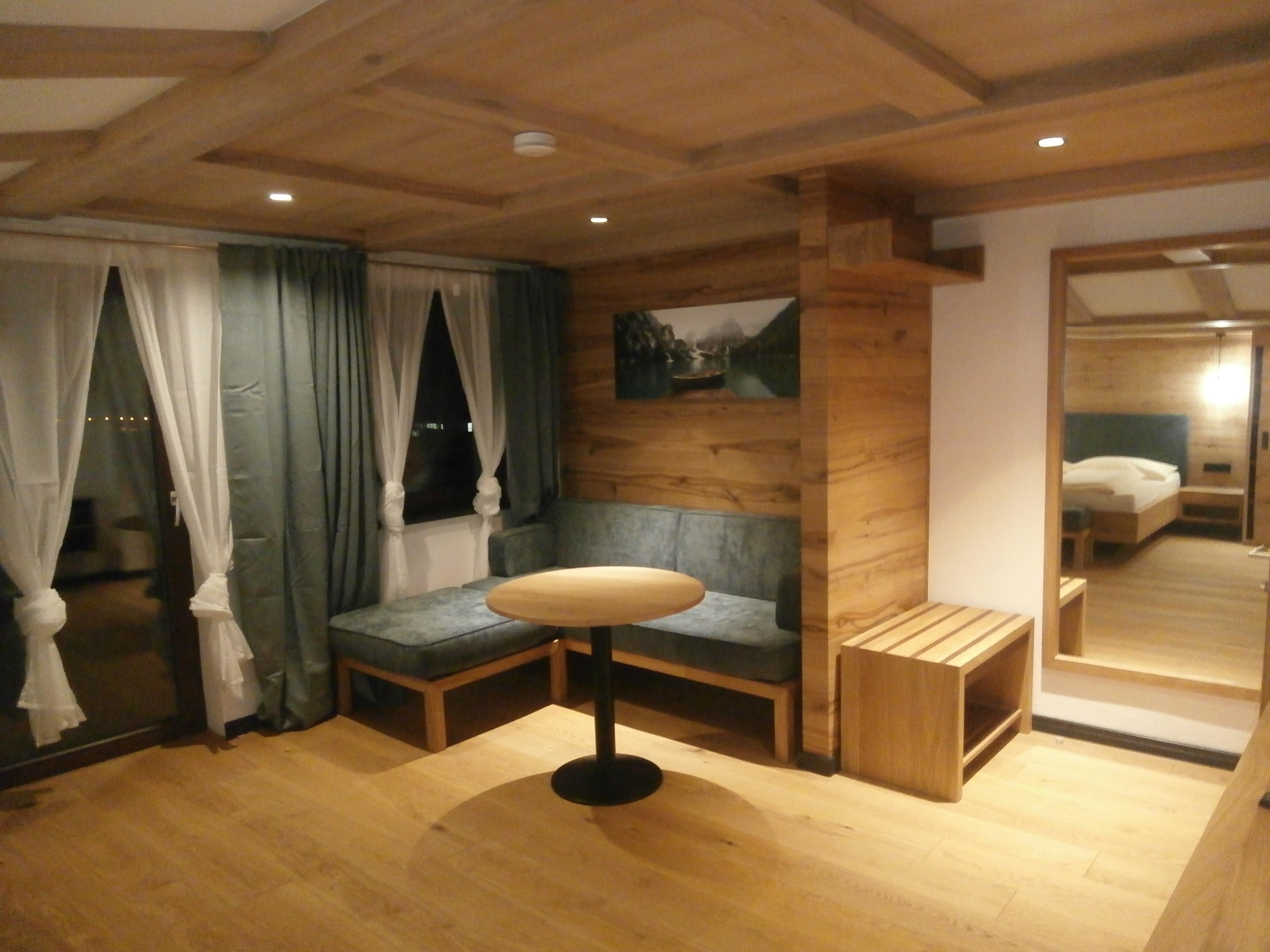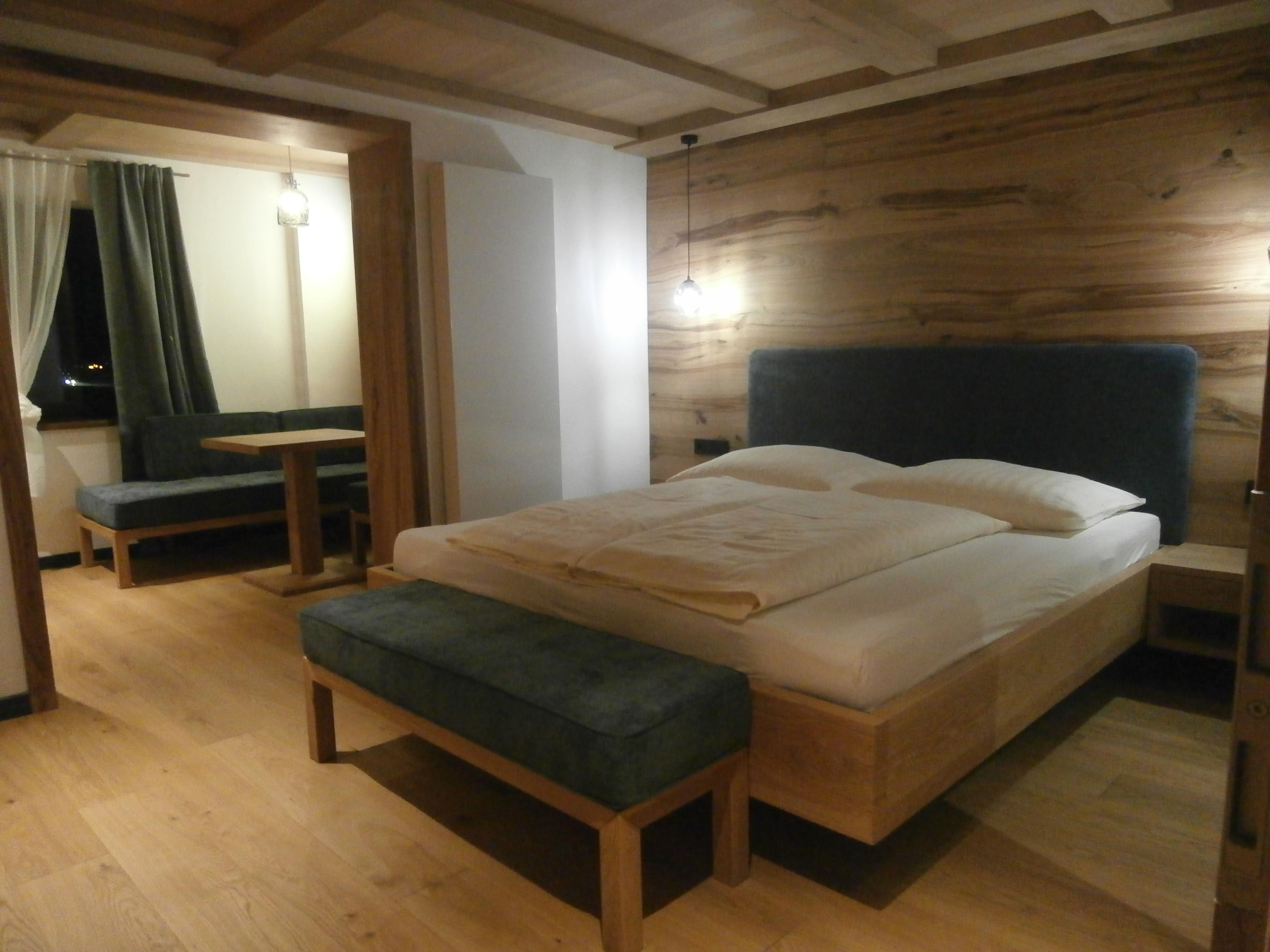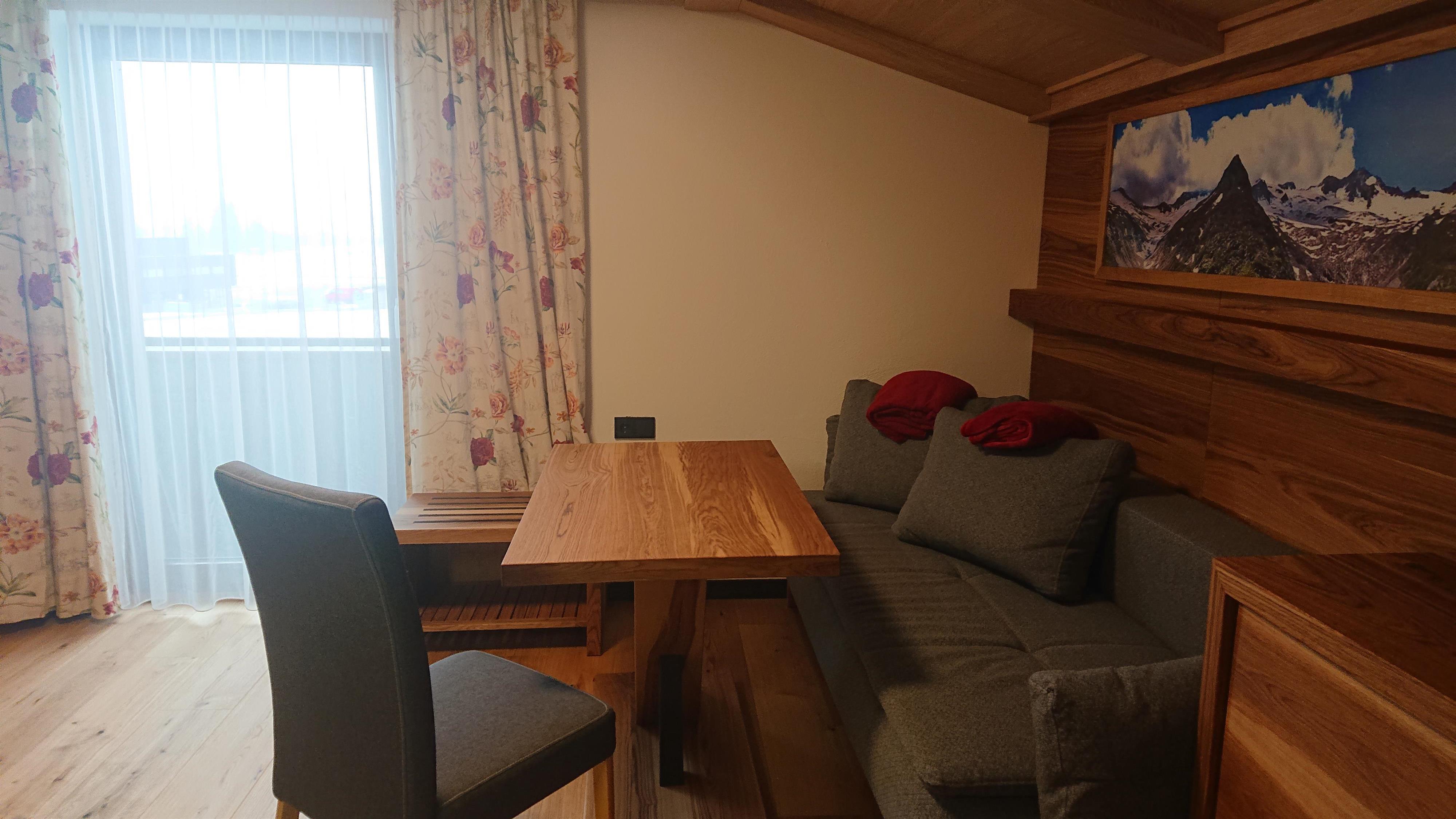 Im Landhausstil gemütlich eingerichtetes Doppelzimmer mit eingebauter Sitzecke, Dusche, WC, Balkon, Safe und Sat-TV.
