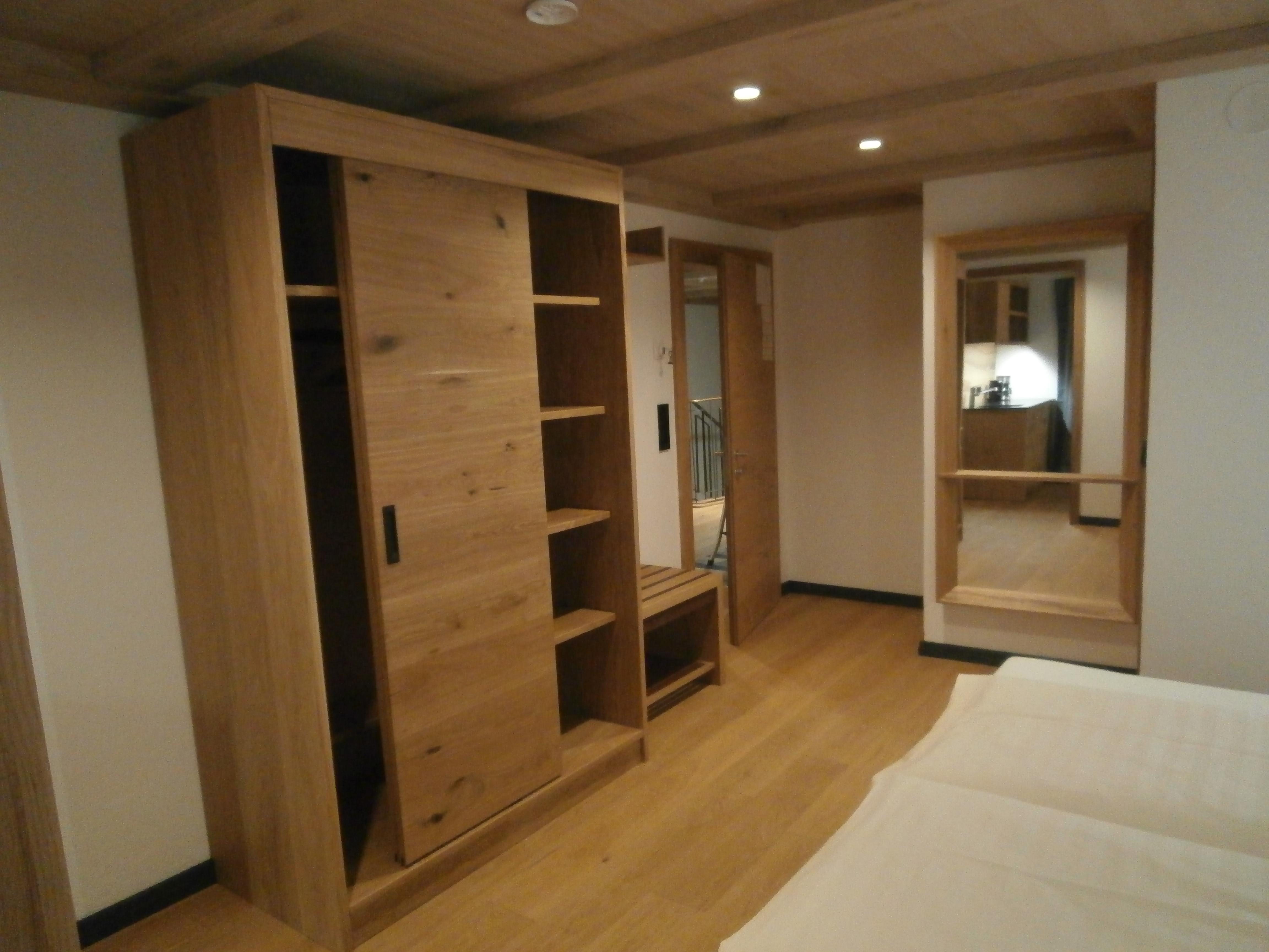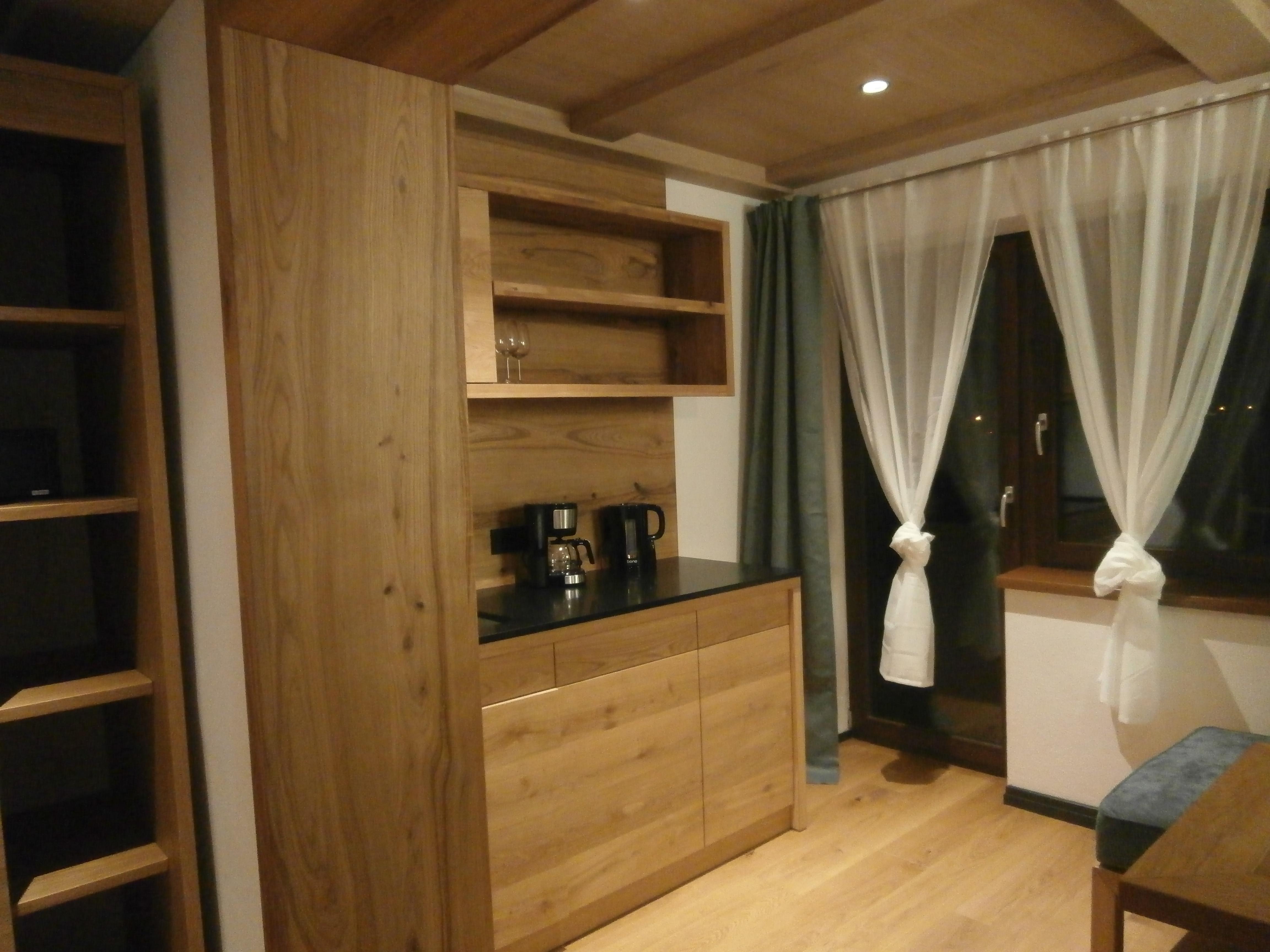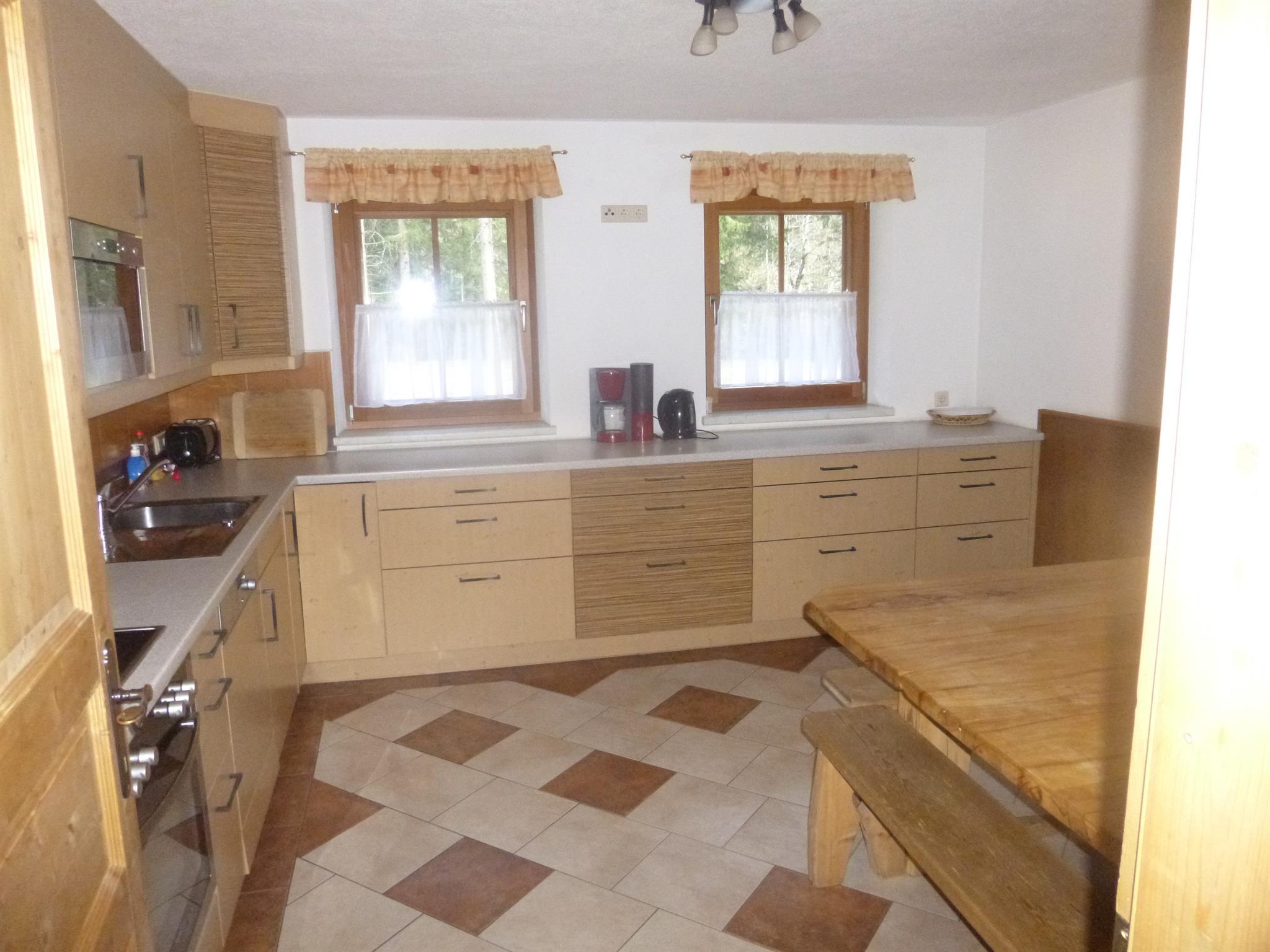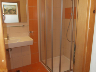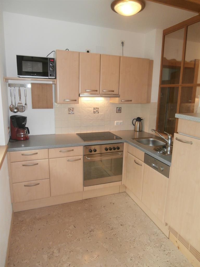 Ferienwohnung im Obergeschoß mit offenen Dachstuhl, Vorraum mit offener großer Wohnküche ( voll eingericht. mit Geschirrspüler ) mit Kachelofen ,2 Dreibettzimmer, 1 Doppelzimmer,1 kleines Schlafzimmer mit Etagenbett,ein Badezimmer mit Badewanne und