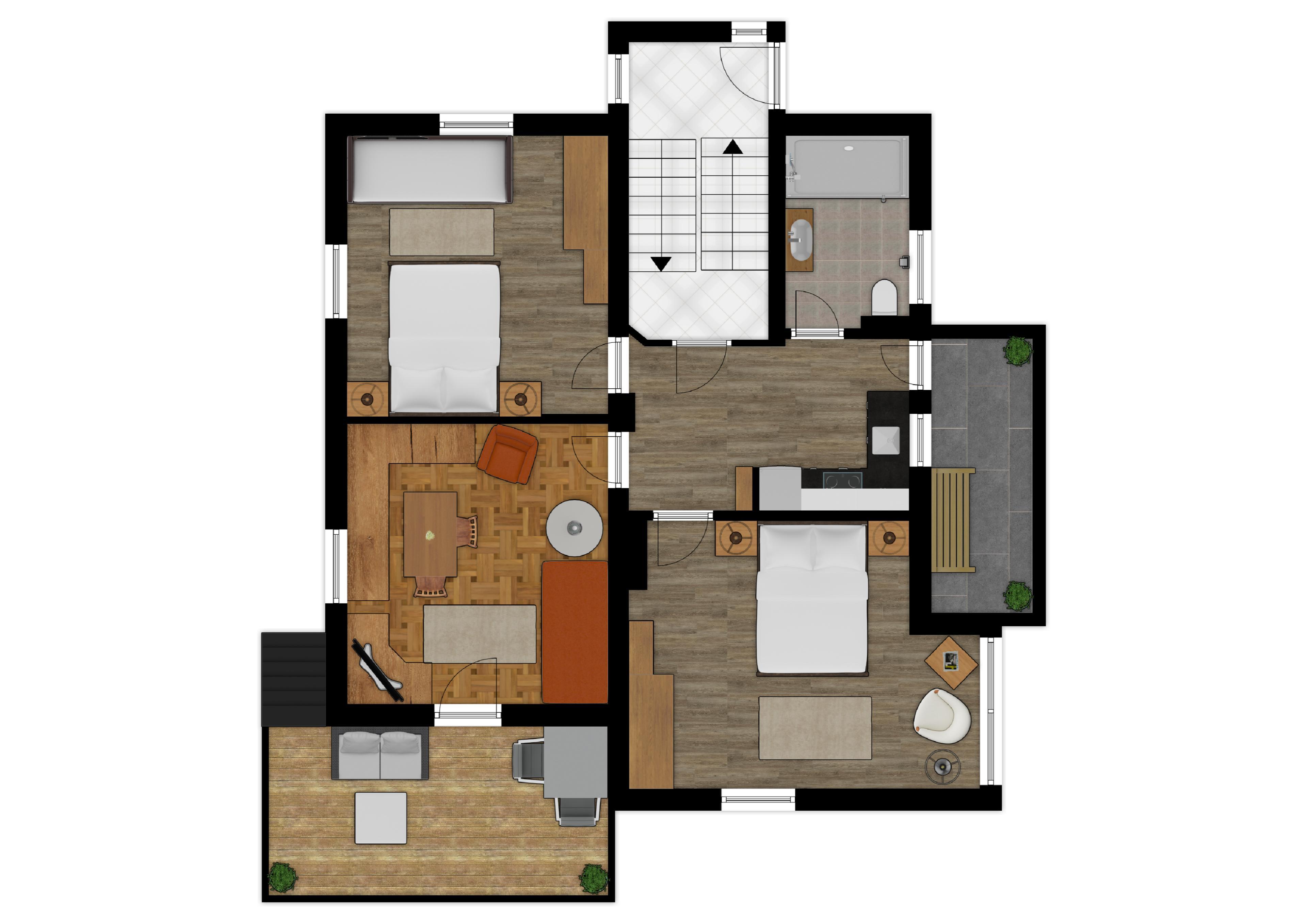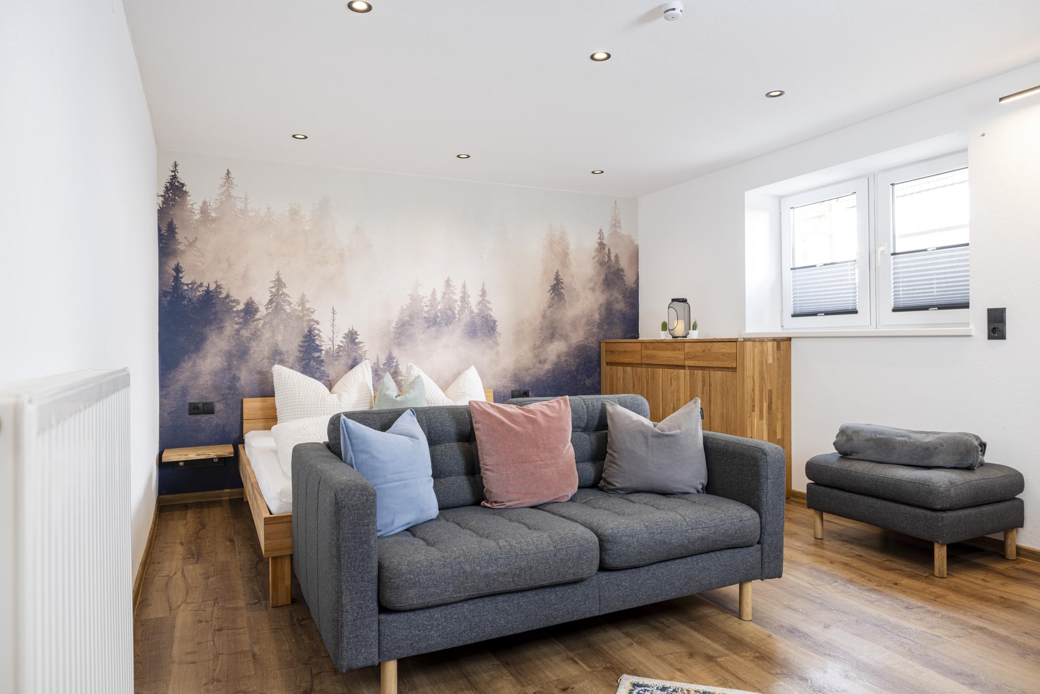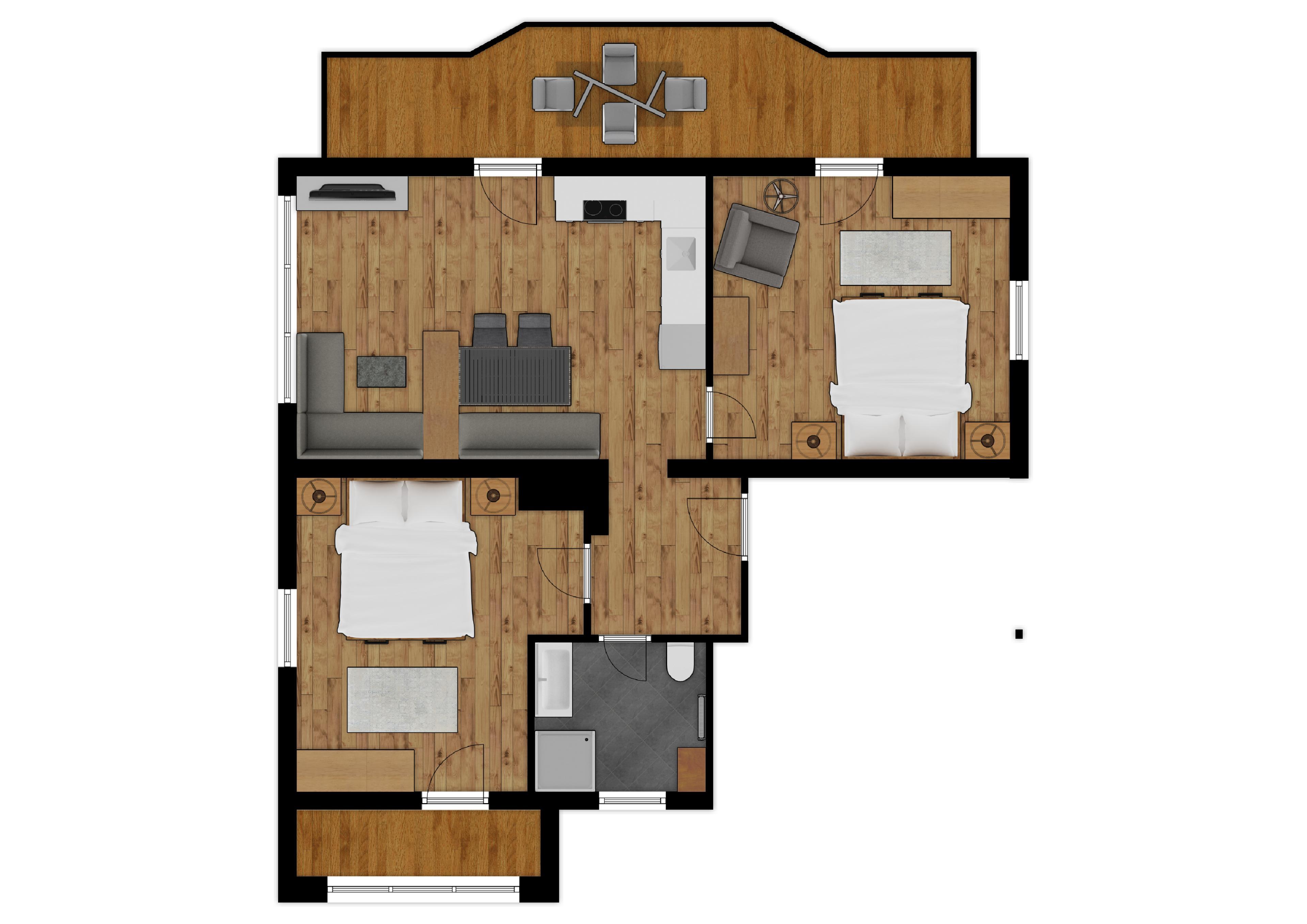 Neu erbautes Nichtraucher-Apartment mit einer Fläche von 70m² in exklusiver Ausführung bestehend aus: - Zirbenstube (mit Sitzecke, Diwan, Fernsehsessel, Flat-TV), - 1 Schlafzimmer mit Doppelbett 180x200cm und drittem Bett 80x200cm, - 1 Schlafzimmer mit