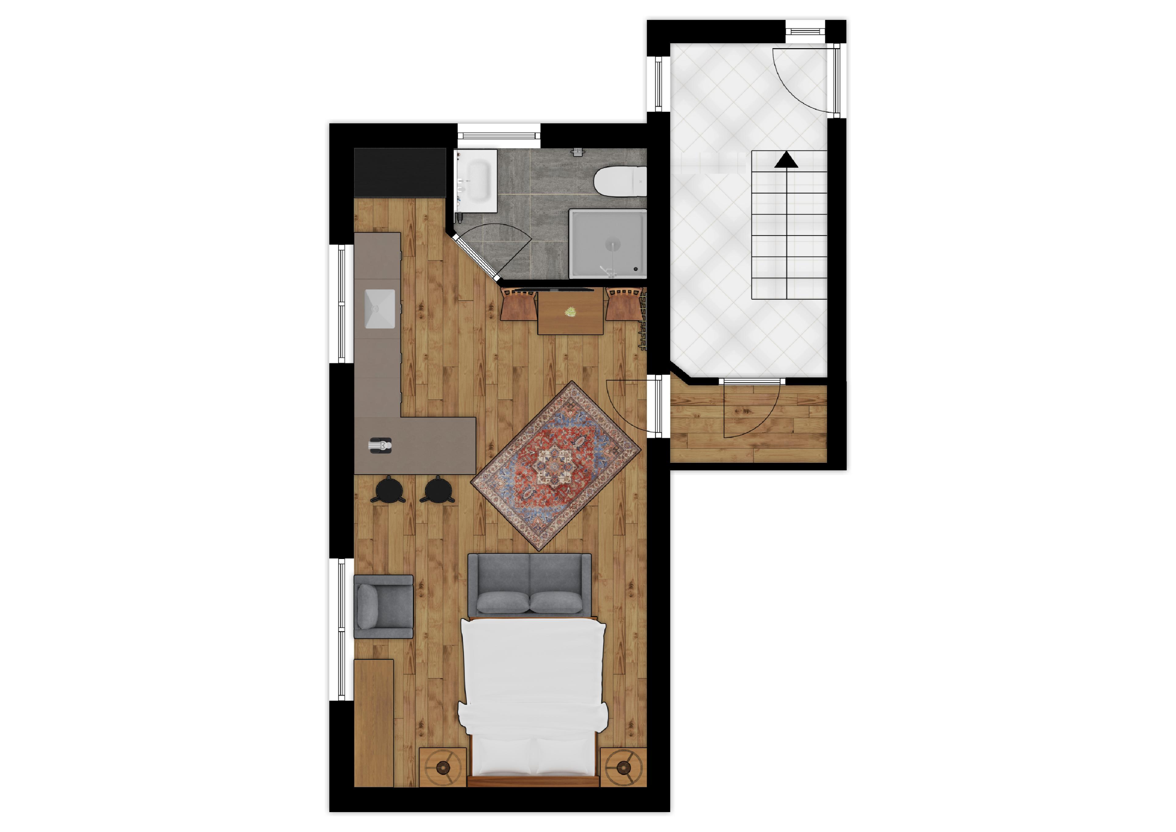 Im Tiefparterre gelegenes neu eingerichtetes Studio Apartment für 2 Personen im Zentrum von Mayrhofen. Kein Balkon.
