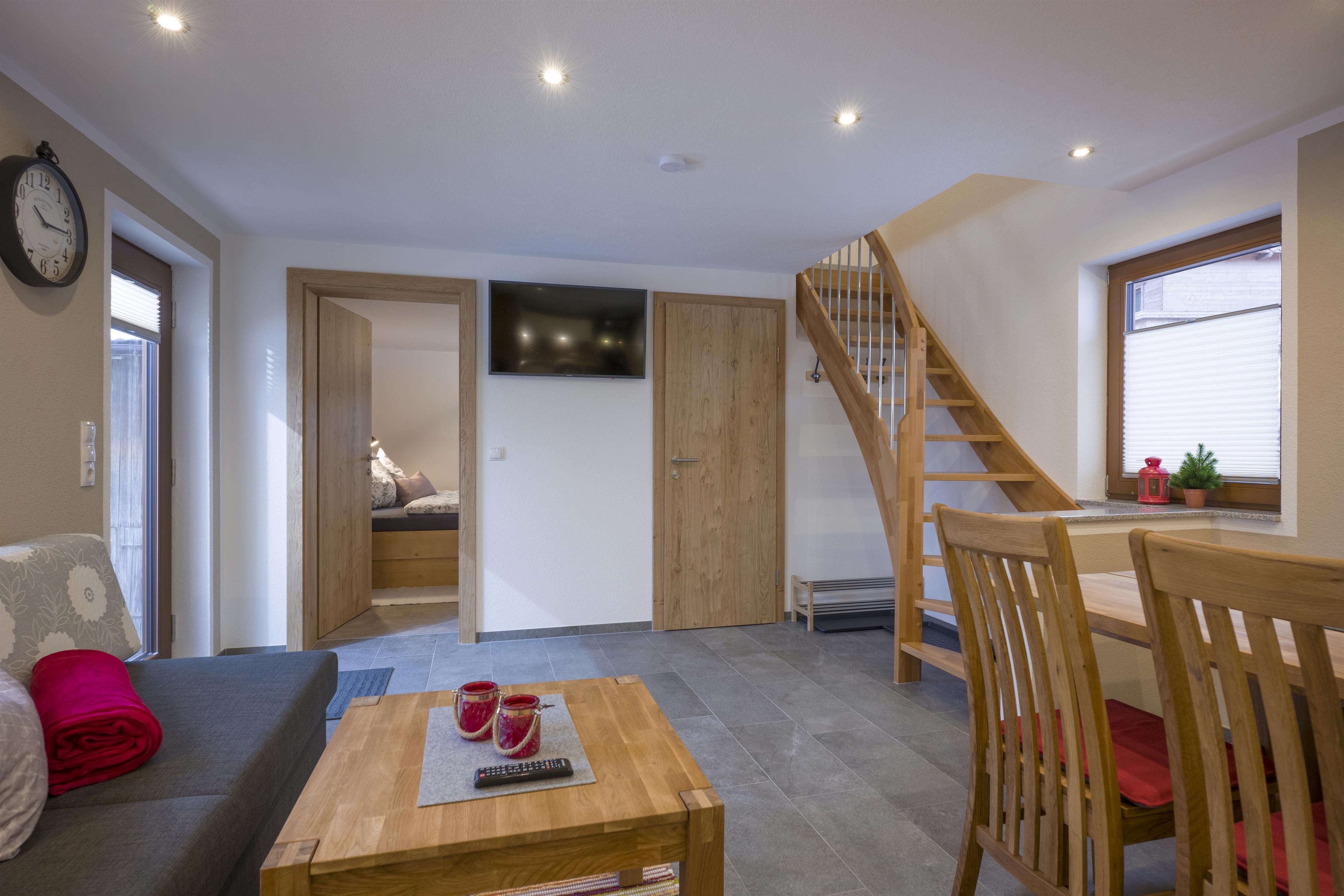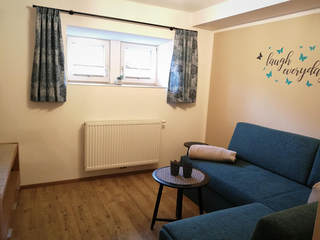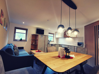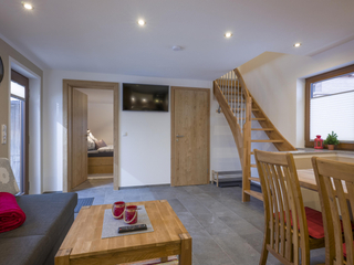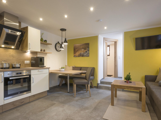 voll ausgestattete Küche mit Essbankgruppe, Geschirrspüler, Ceran-Kochfeld und Backofen, Mikrowellenherd, Kaffeevollautomat, Dunstabzug, TV kleines gemütliches Wohnzimmer mit Sofa und TV, Schlafmöglichkeit für 1-2 Personen Ausziehcouch 1 Schlafzimmer für