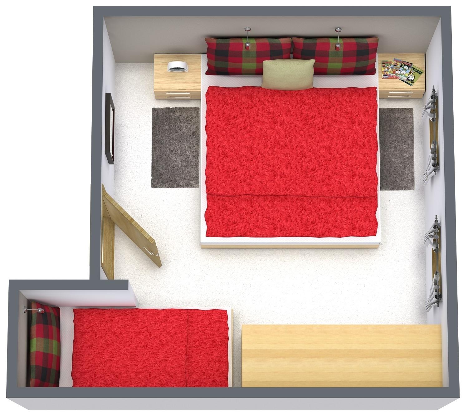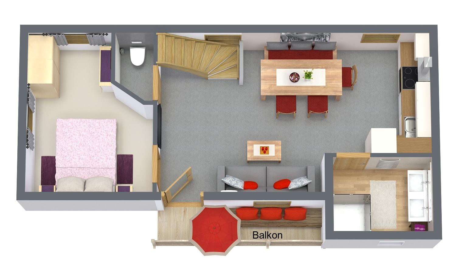 Wohnküche mit SAT-TV, Esstisch und Sofa, Dusche, separates WC, Schlafzimmer für 2 Personen, Schlafkoje für 2-3 Personen