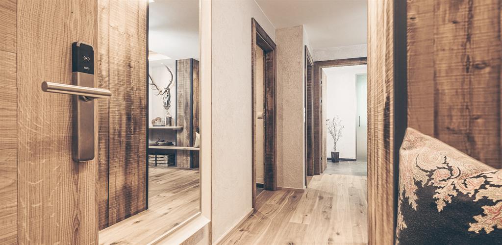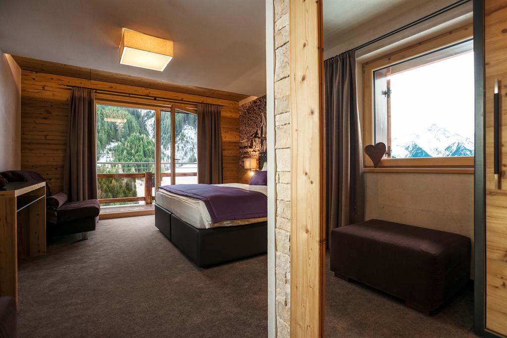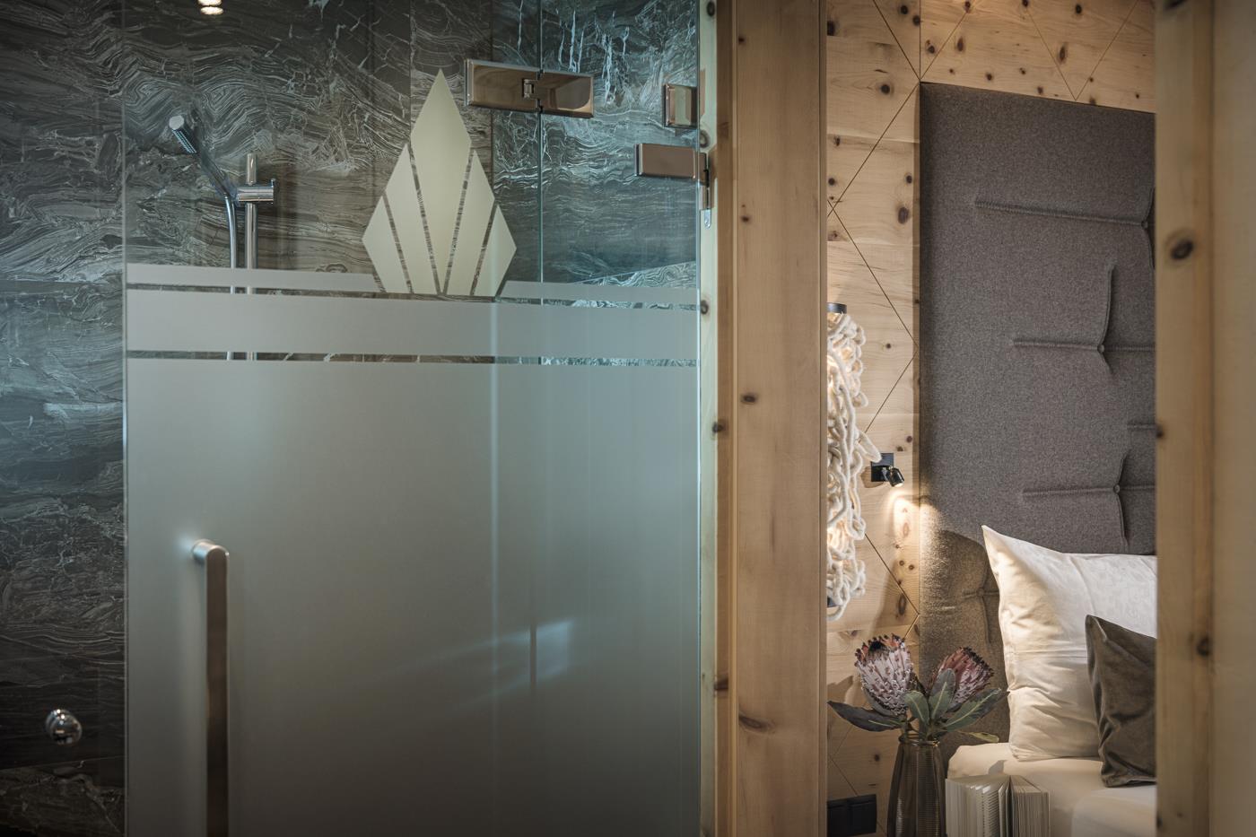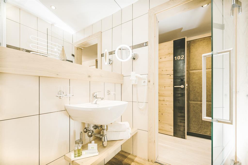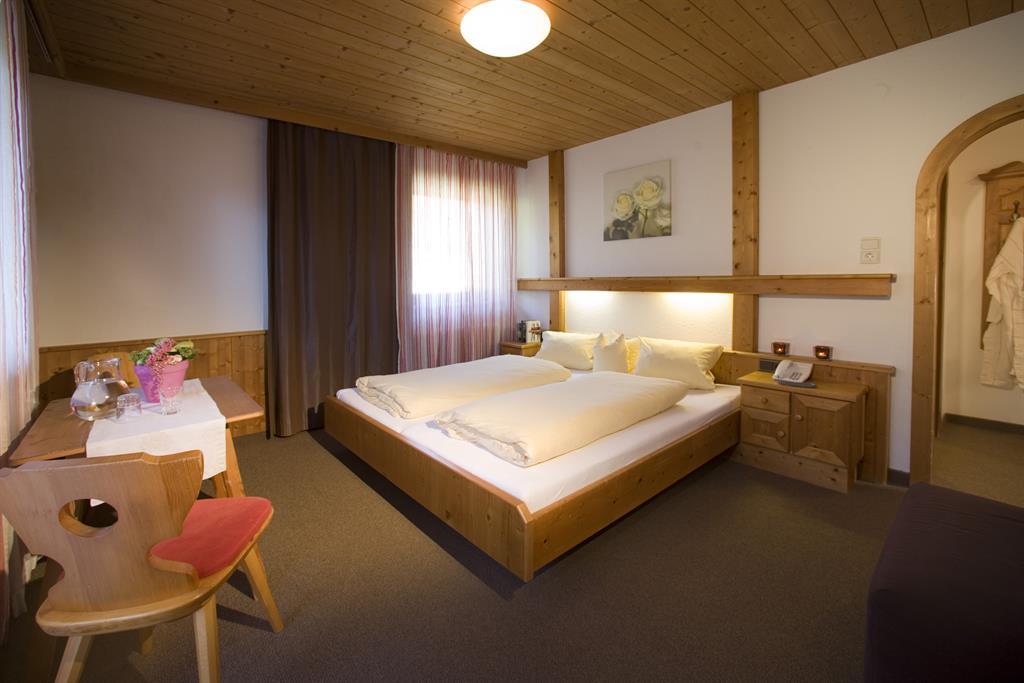 Doppelzimmer Zirbennest Zirbenzimmer zum Entspannen Größe ca. 22m², Regendusche (inkl. Duschgel/Seife), WC, Föhn, Bademantel, Balkon, Flat Screen (32") mit Sat Anschluss, Zimmersafe und kostenlosem WLAN-Zugang. Balkon mit Tisch und Stühlen, zur Nordseite