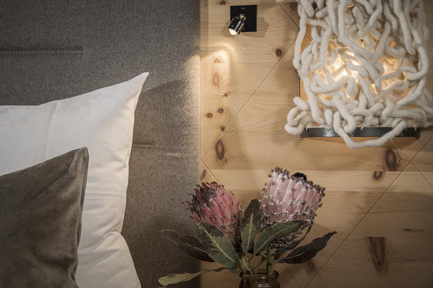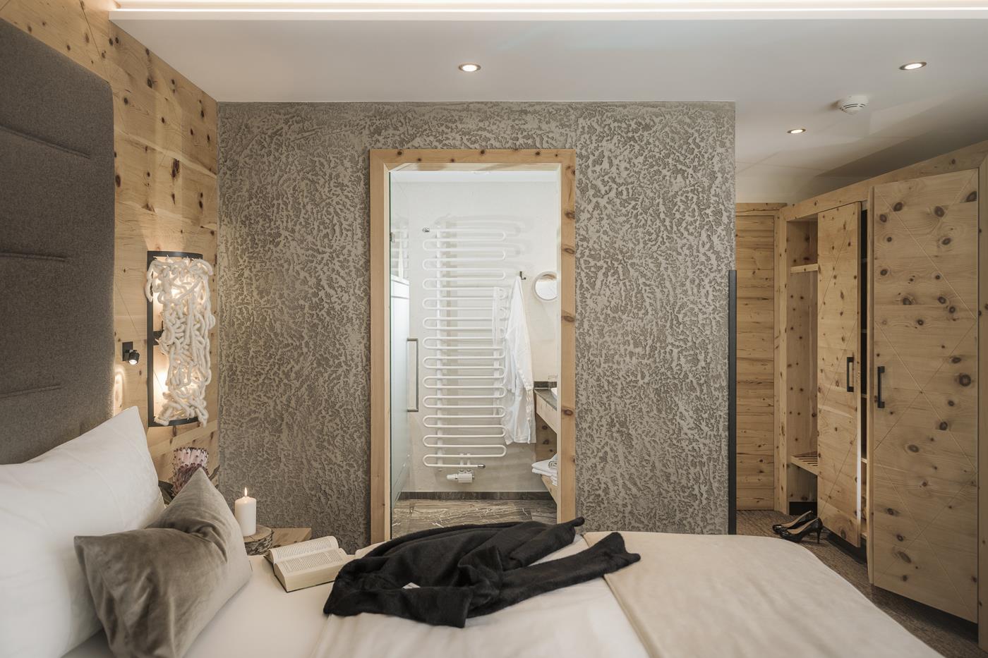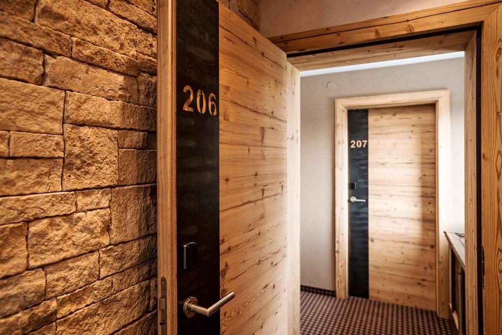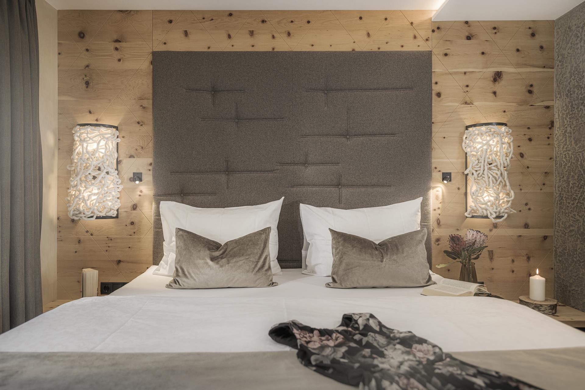 Doppelzimmer Zirbennest Zirbenzimmer zum Entspannen Größe ca. 22m², Regendusche (inkl. Duschgel/Seife), WC, Föhn, Bademantel, Balkon, Flat Screen (32") mit Sat Anschluss, Zimmersafe und kostenlosem WLAN-Zugang. Balkon mit Tisch und Stühlen, zur Nordseite