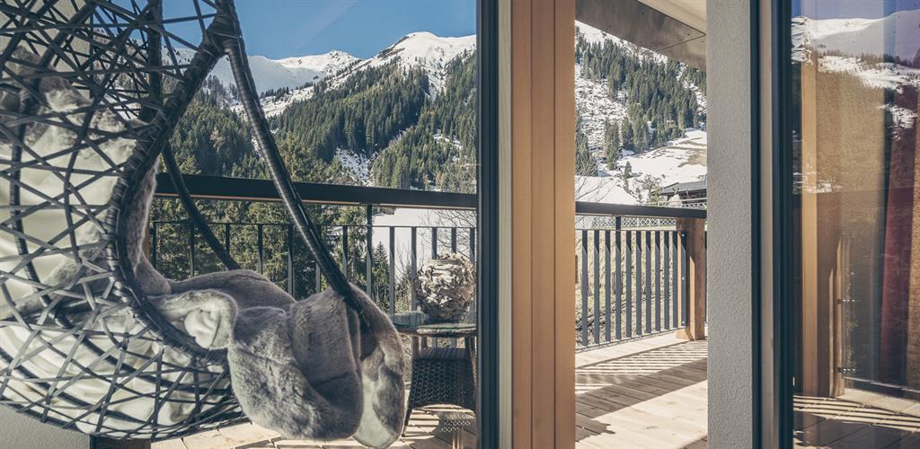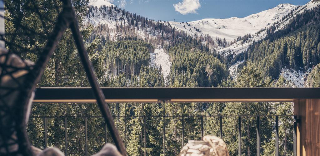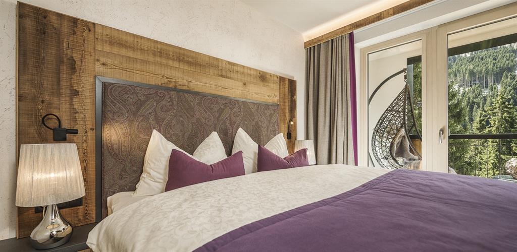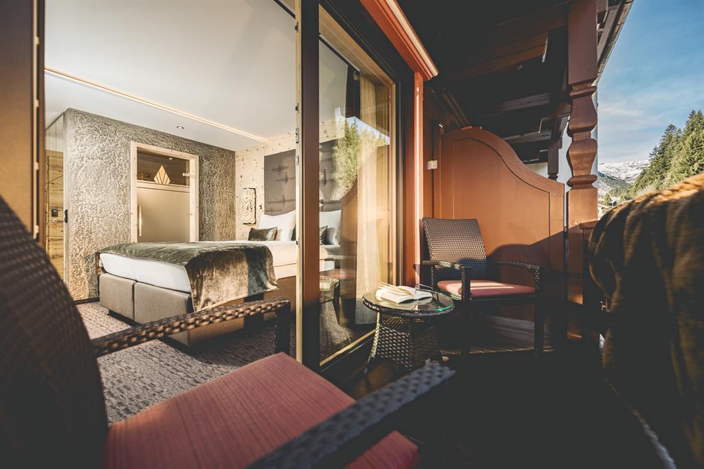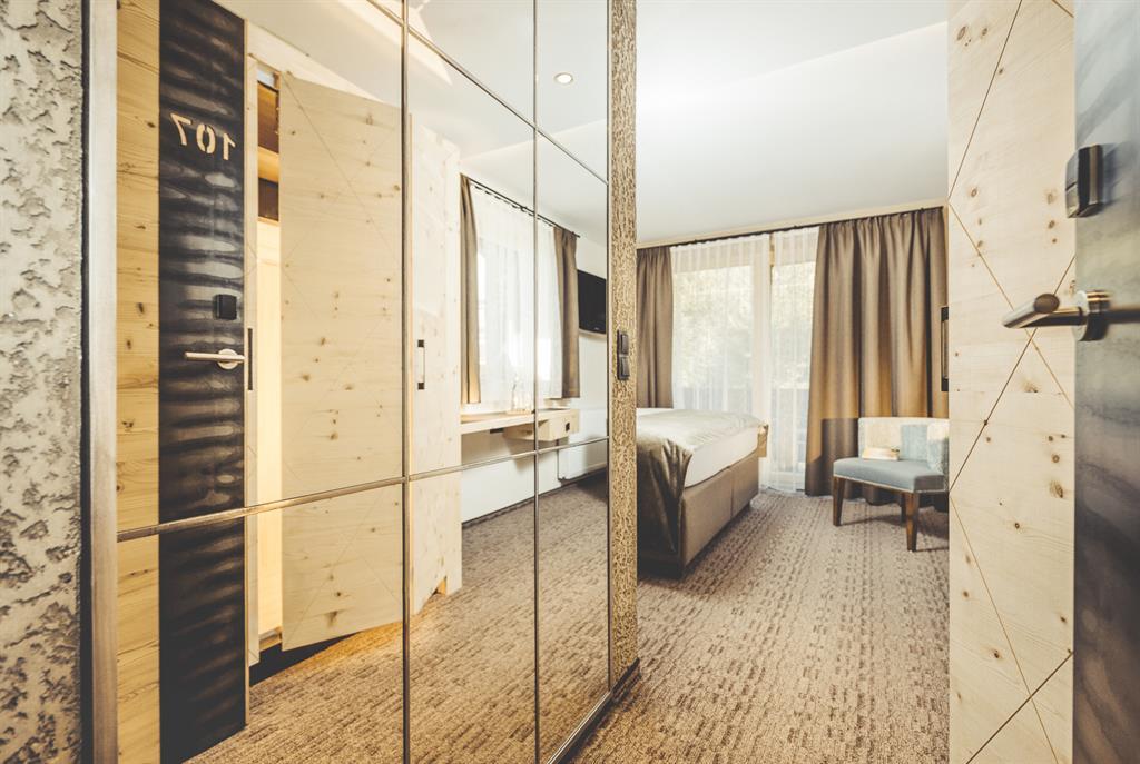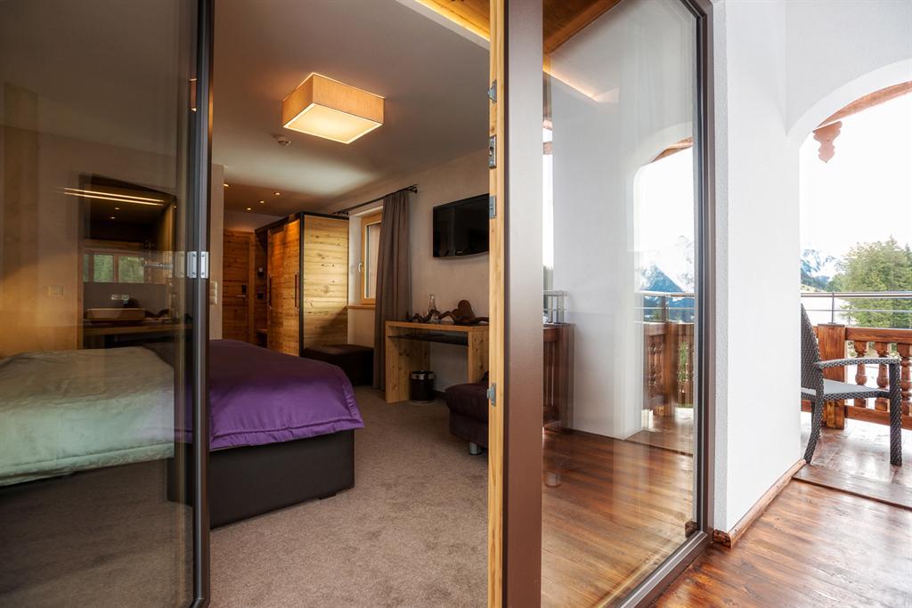 Doppelzimmer Zirbe Zirbenzimmer zum Entspannen Größe ca. 22m², Regendusche (inkl. Duschgel/Seife), WC, Föhn, Bademantel, Balkon, Flat Screen (32") mit Sat Anschluss, Zimmersafe und kostenlosem WLAN-Zugang. Eckzimmer - Balkon mit Tisch und Stühlen, zur
