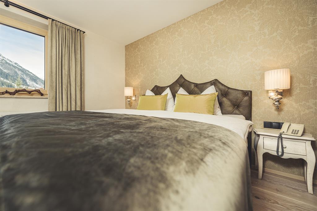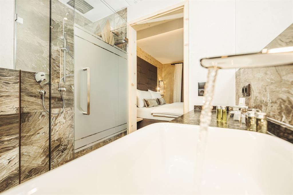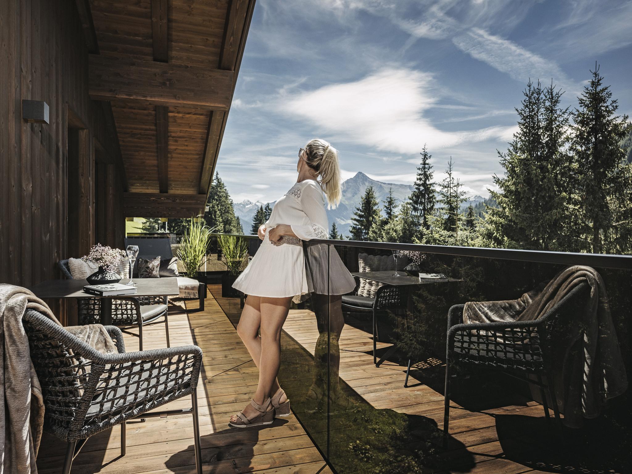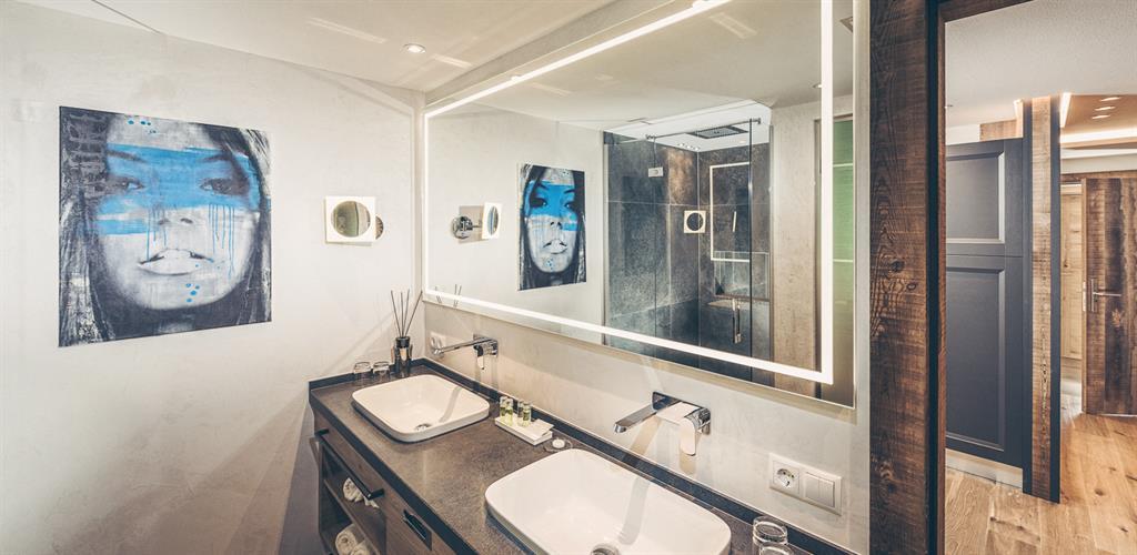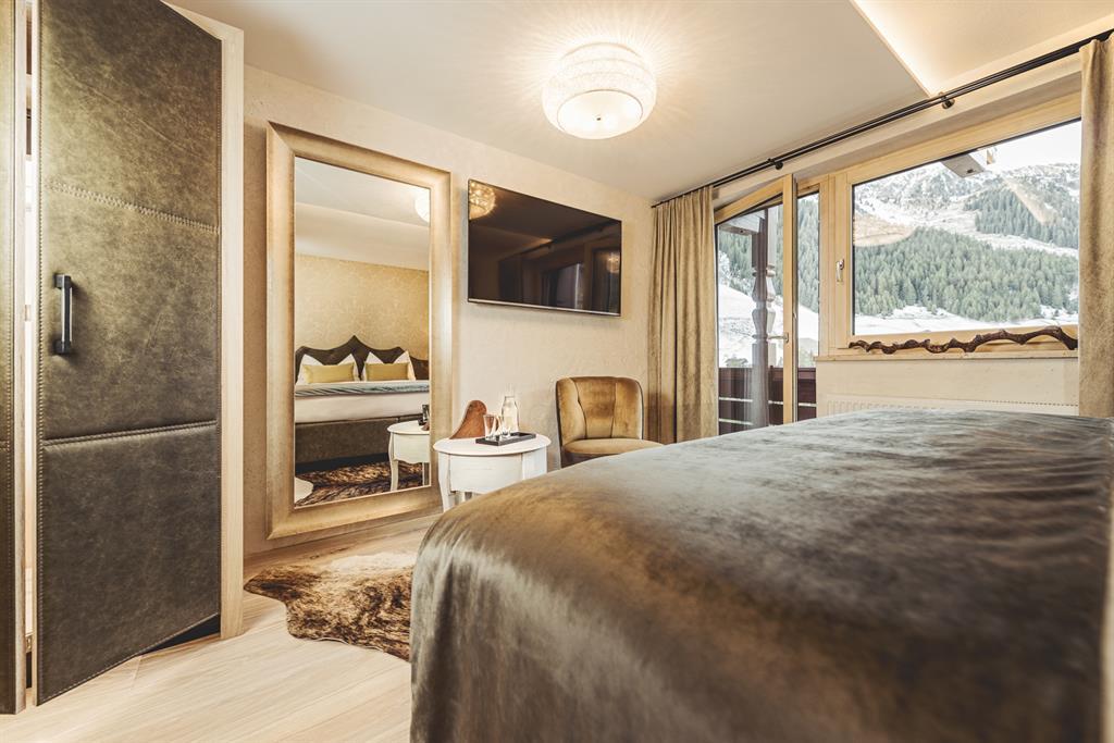 Doppelzimmer Zirbe Zirbenzimmer zum Entspannen Größe ca. 22m², Regendusche (inkl. Duschgel/Seife), WC, Föhn, Bademantel, Balkon, Flat Screen (32") mit Sat Anschluss, Zimmersafe und kostenlosem WLAN-Zugang. Eckzimmer - Balkon mit Tisch und Stühlen, zur