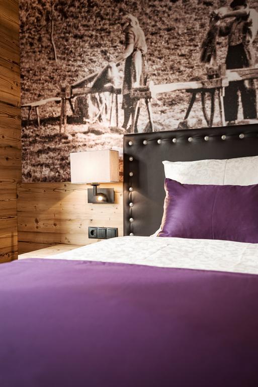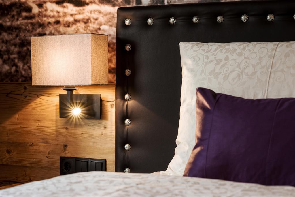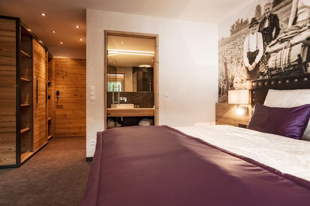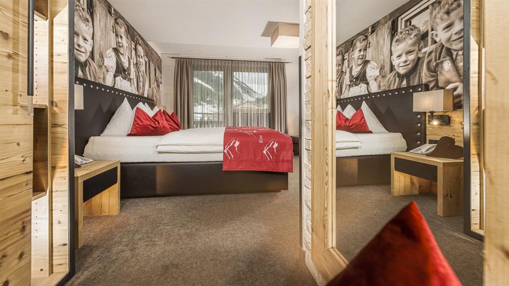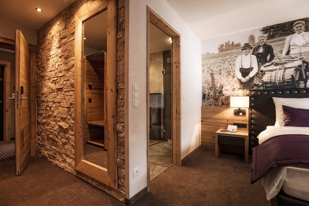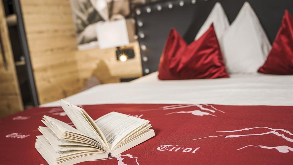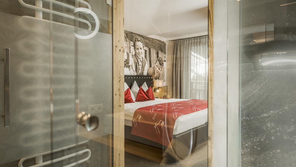 Doppelzimmer Tirol Tirolzimmer mit Altholz, ganz in rot. Größe ca. 25m², Regendusche (inkl. Duschgel/Seife), WC, Föhn, Bademantel, Balkon, Flat Screen (32") mit Sat Anschluss, Zimmersafe und kostenlosem WLAN-Zugang. Kleiner, runder Balkon mit Tisch und