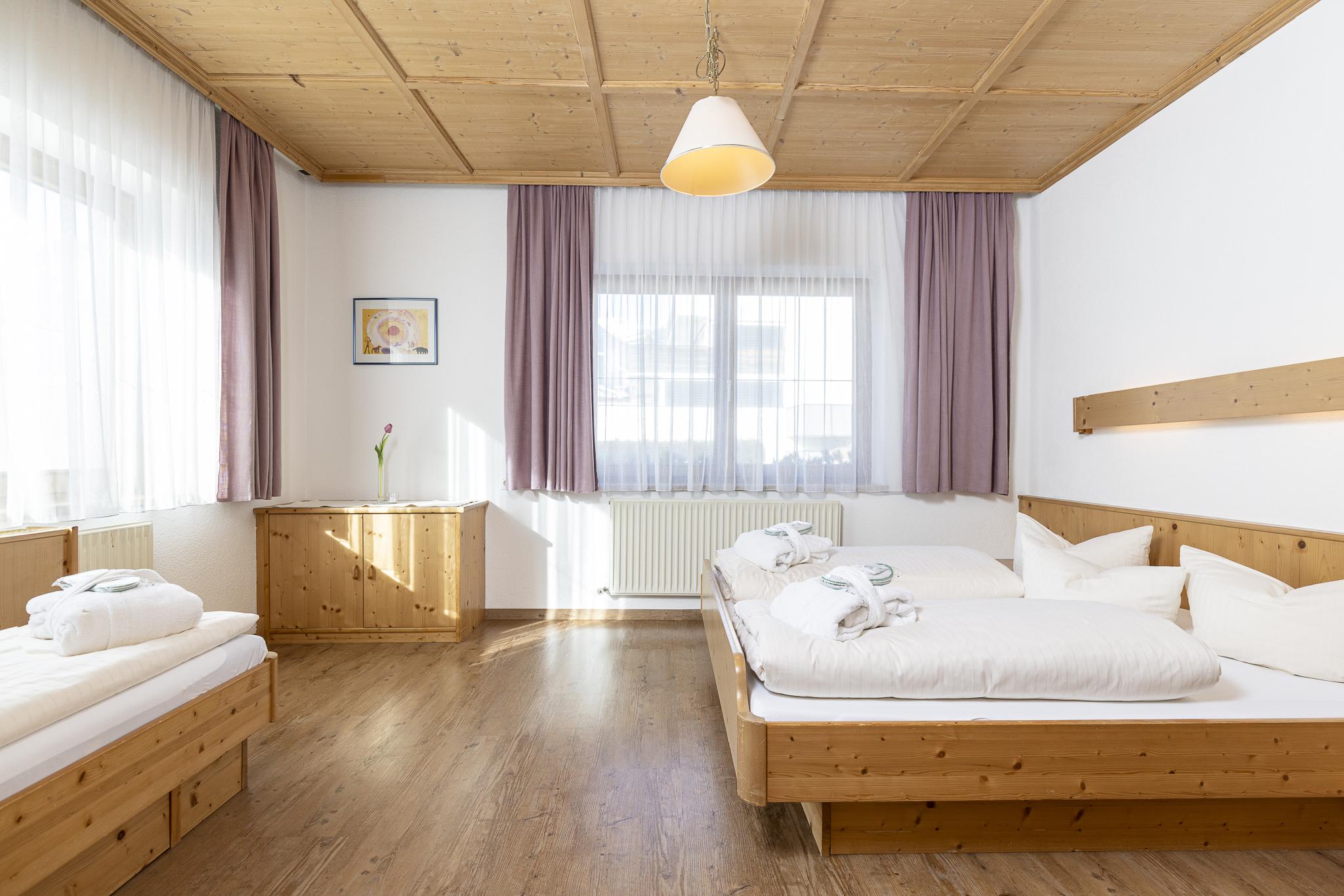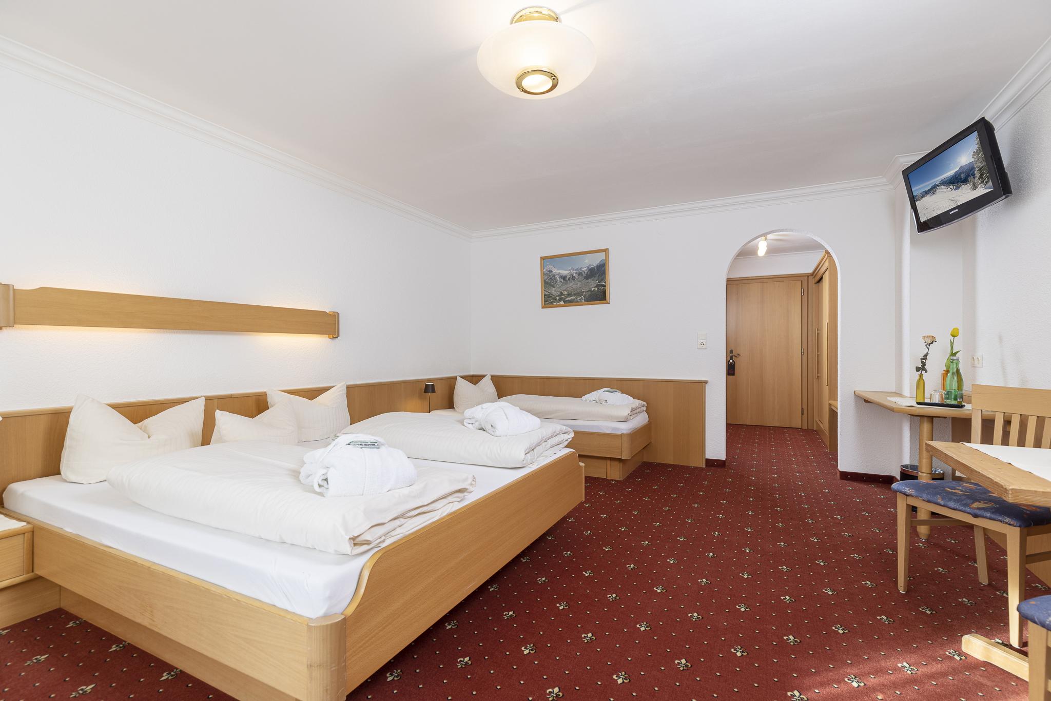 Geräumiges Zimmer mit Doppelbett, Einzelbett und Schlafsofa, DU/WC/Fön, Terrasse, Kabel-TV mit integriertem Radio, Telefon, Zimmersafe Auf Wunsch Kinderbett kostenlos möglich!