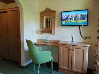 Gemütliches Einzelzimmer mit Balkon, Dusche/WC, Haarföhn, Safe, Telefon, Radio, Flat-TV mit Panoramabild.