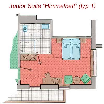 Juniorsuite mit Himmelbett, Dusche/WC/Balkon, Couch als 3. Bett möglich, W-LAN