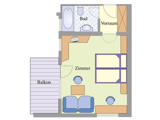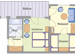 Doppelzimmer mit optisch getrenntem Wohnteil, Bad oder Dusche/WC, Balkon, Radio, Telefon, SAT-TV, Safe, Sitzgruppe, Bademantel, Fön, 32 - 35 m²