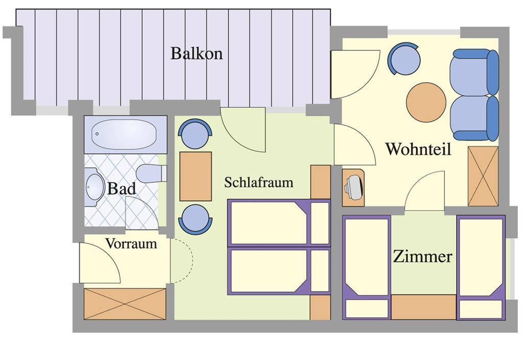 Familienzimmer mit Bad oder Dusche/WC, gemeinsamer Eingang, 2 getrennte Schlafzimmer, Balkon, Sat-TV, Radio, Safe, Bademäntel und Fön, ca. 50m²