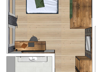 Top Ausstattung mit exklusivem Interieur und besonderem Design – großzügiges Doppelzimmer mit Boxspringbett auf höchstem Schlafkomfort mit Leseleuchten – Couch (auch als Schlafcouch für 1-2 Pax möglich) - 50 Zoll Flat-TV – großzügiger Schreibtisch –