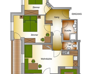 Appartement mit 60 m2, 2 Schlafräume, Küche mit Wohnraum, Dusche, WC extra