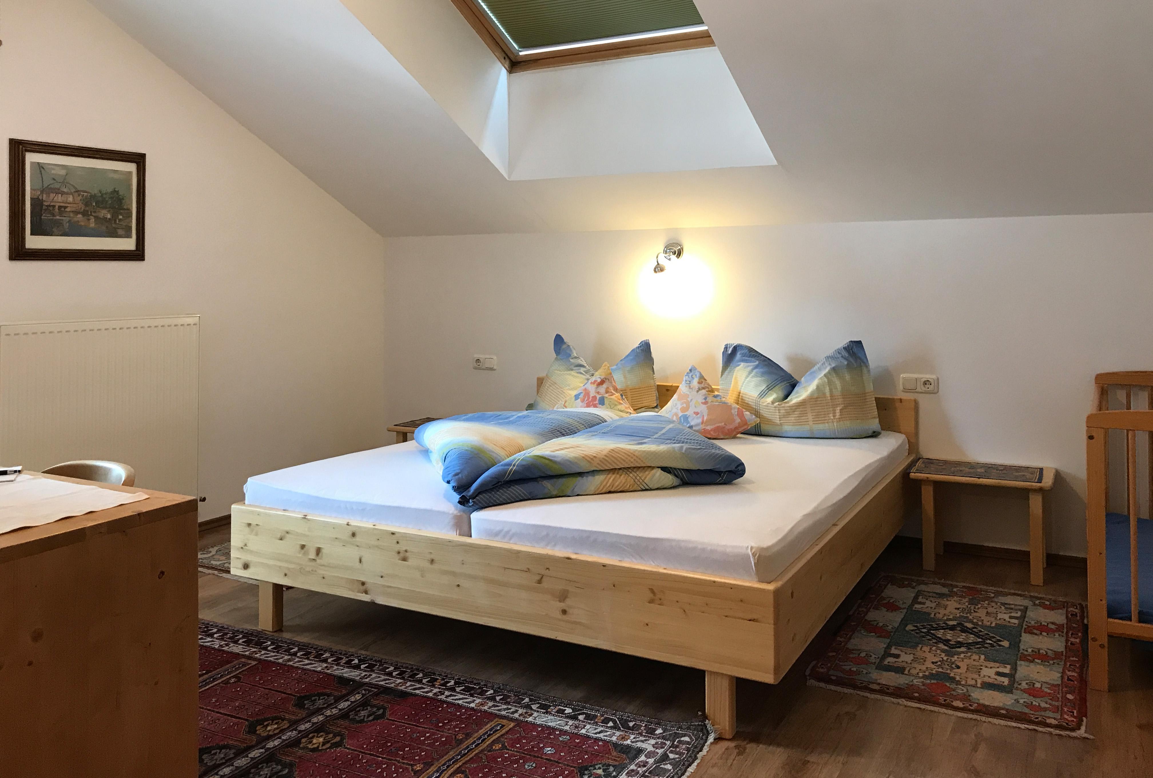 Offene Dachgeschosswohnung: 76 qm, grosszügiger Wohnbereich mit Kueche (komplett eingerichtet mit Geschirrspüler) und Eingangsbereich, 2 getrennte Schlafräume,jeweils mit Doppelbett, Kinderbett, 1 Badezimmer (Badewanne und WC). Bettwäsche, Handtücher,