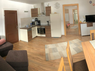 Appartement Kristall - Vollausgestattete Wohnküche mit Geschirrspüler, Kühlschrank mit Gefrierfach, Ceranfeld mit 4 Kochmöglichkeiten, Backrohr, Mikrowelle, Kaffeemaschine, Toaster, Wasserkocher - TV, Radio, Schlafcouch - Essecke für 7 Personen -