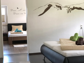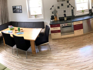 Ferienwohnung PENKEN für 1 - 5 Personen: - Gemütliche vollausgestattete Wohnküche mit Essecke und Couch (Schlafcouch) - 1 Schlafzimmer mit einem Doppelbett und 2 Einzelbetten, zusätzlich eine große Schlafcouch - Badezimmer mit Dusche und WC - Hausgang mit