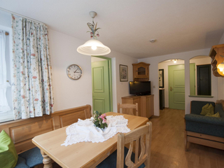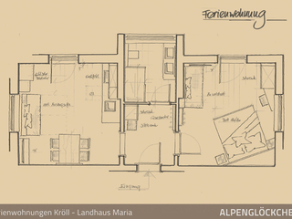 Gemütliche große Ferienwohnung mit 60m² im Landhaus Stil für 2 bis 5 Personen: 2 Doppelzimmer mit eigenem Waschbecken 1 Badezimmer mitDusche/WC, gemütliche große Wohnküche mit Sitzecke komplett eingerichteter Küchenblock (Backrohr, Mikro,