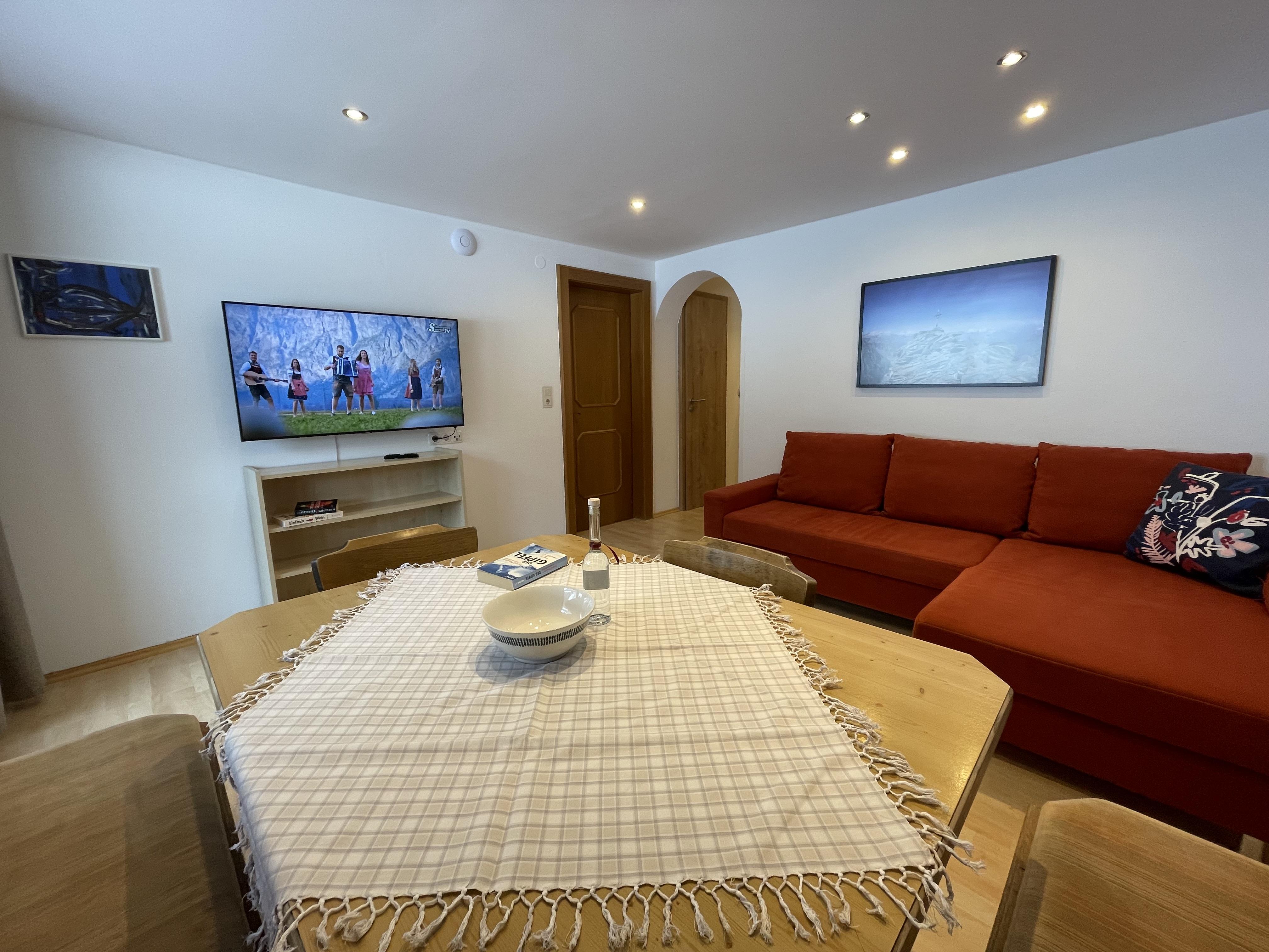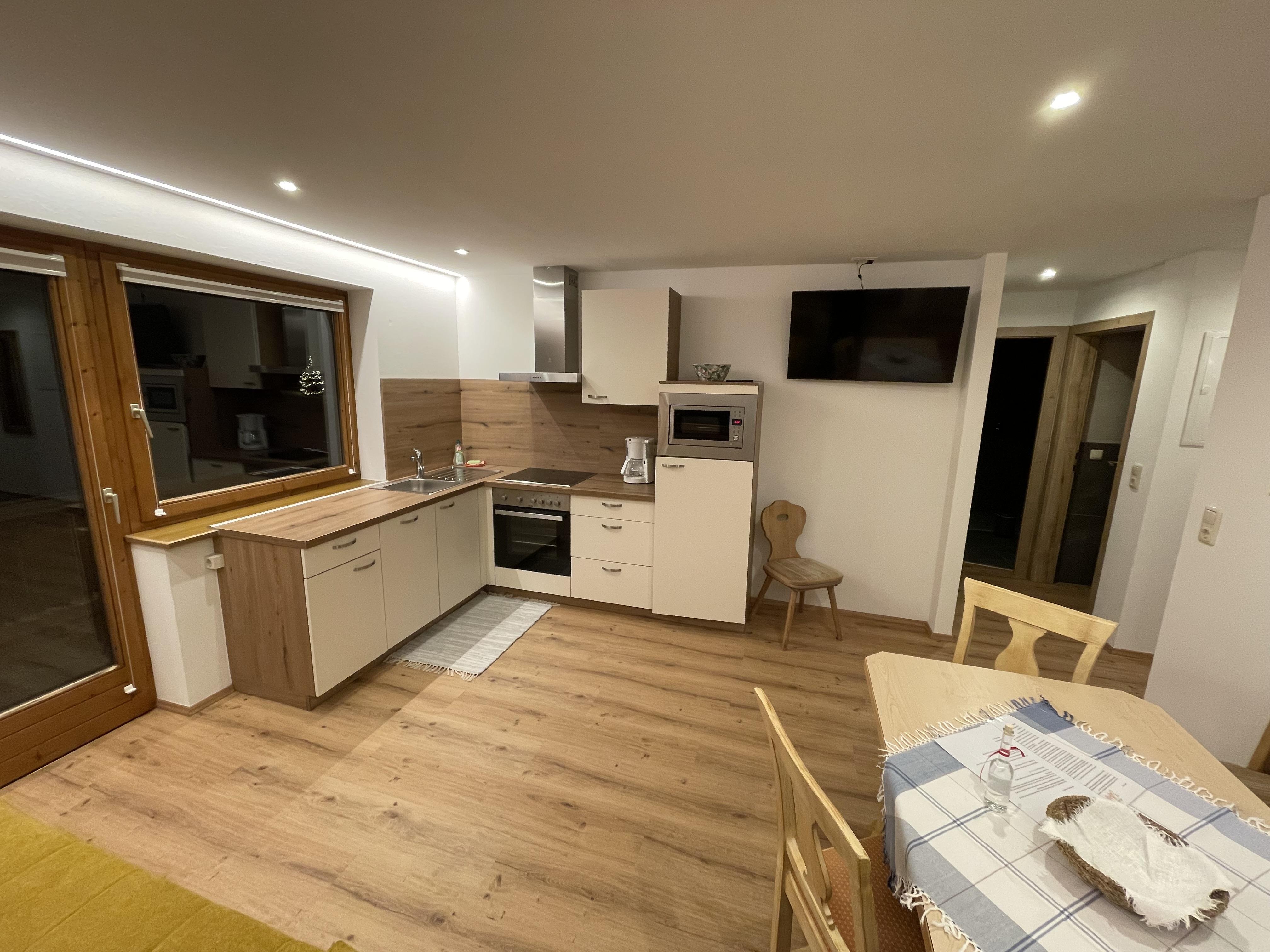Gemütliche Ferienwohnung, Küchenblock, Wohnzimmer mit großem Eßtisch und Sat TV, 3 Schlafzimmer, Bad/WC u. Balkon