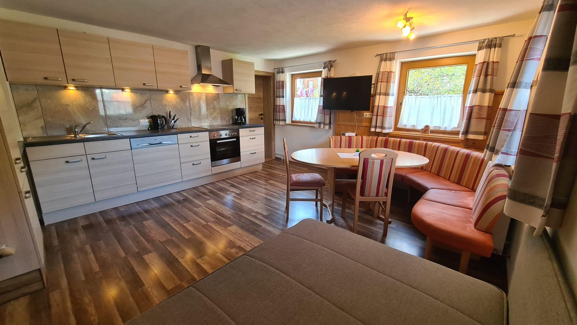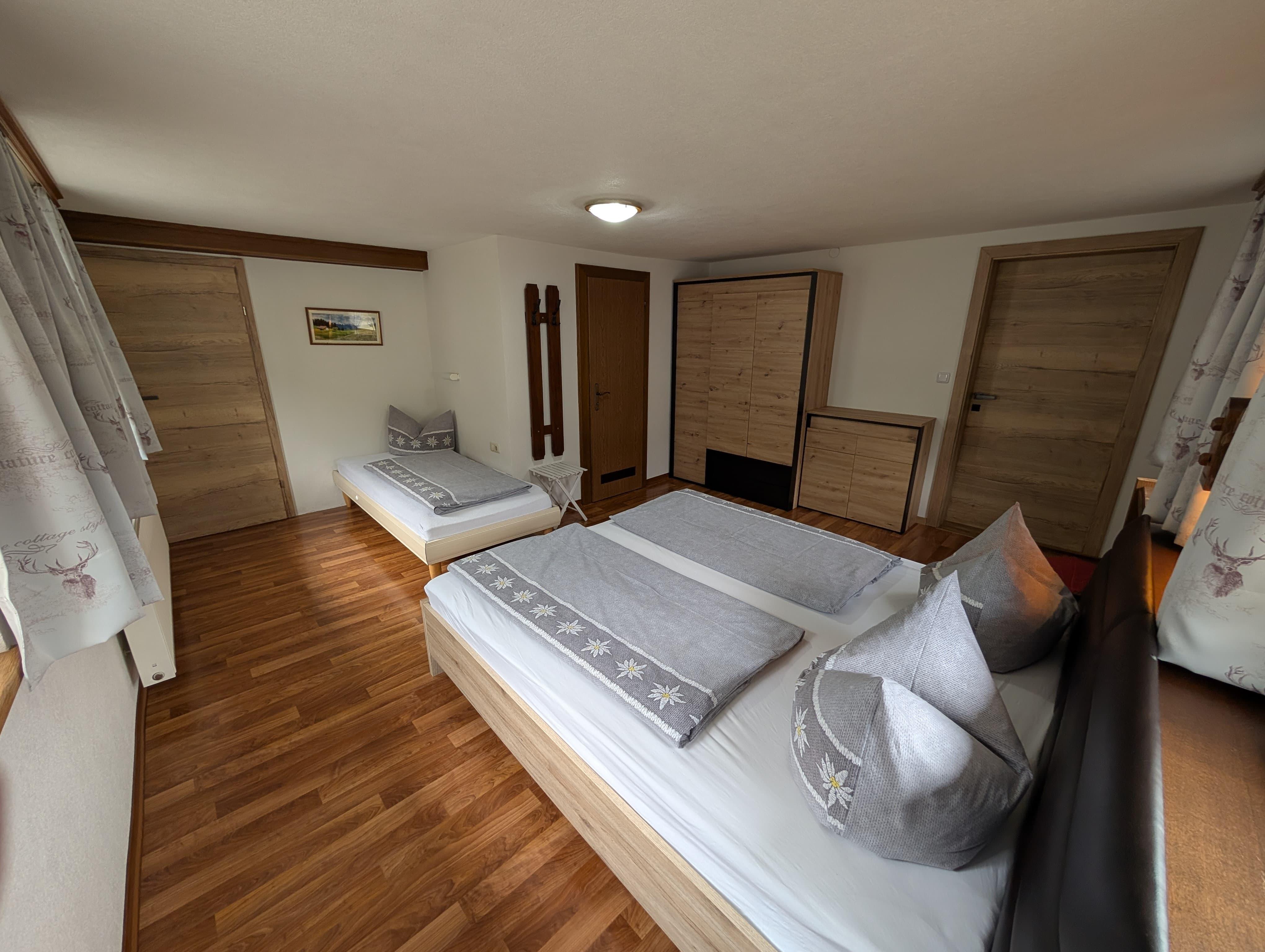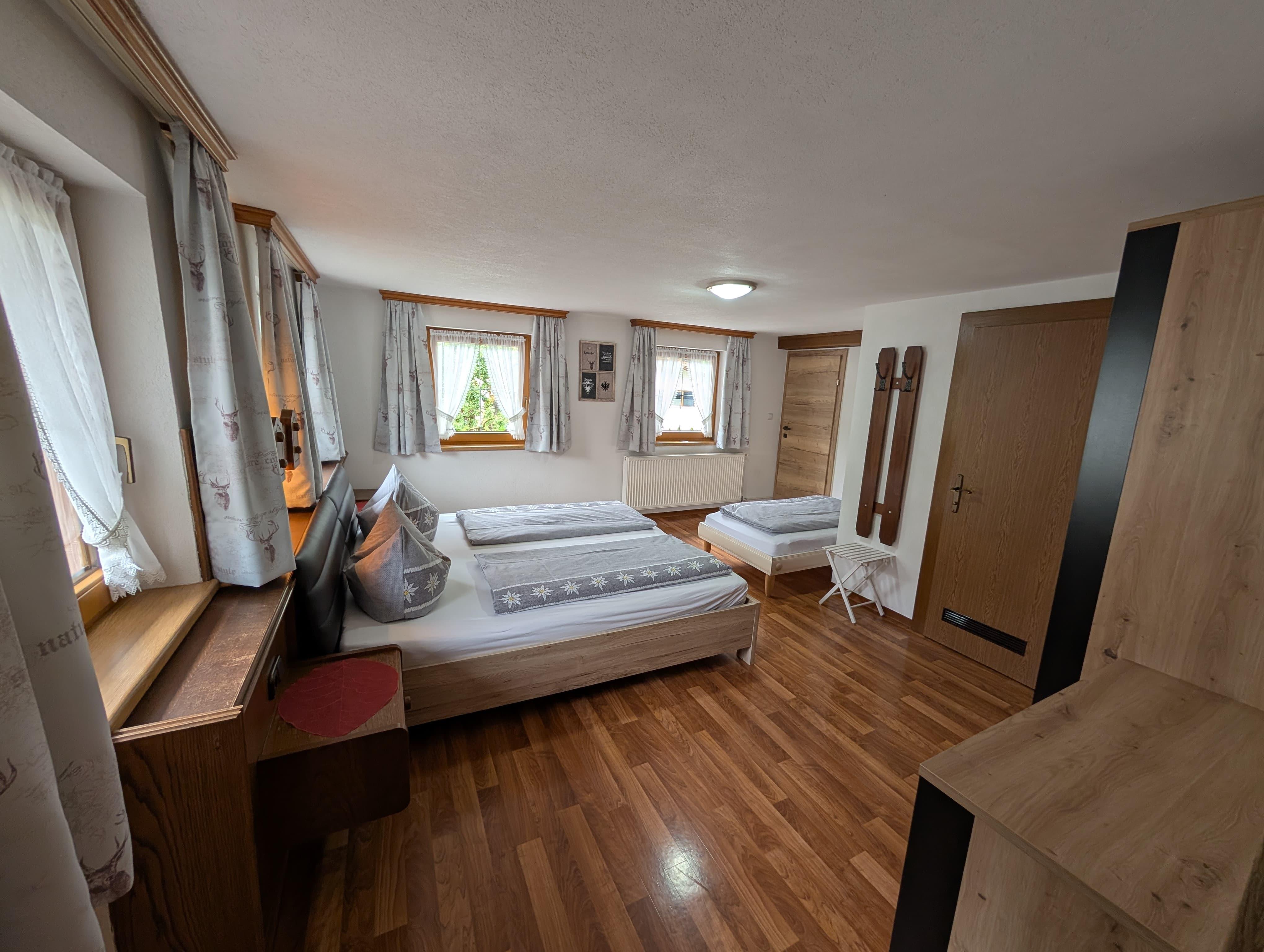 Wir bieten eine gemütliche Ferienwohnung mit Platz für bis zu 5 Personen. die Wohnung ist ausgestattet mit einer geräumigen Wohnküche, einem Dreibettzimmer, einem Doppelbettzimmer, einem Bad sowie einem Balkon, von dem Sie die herrliche Bergwelt genießen