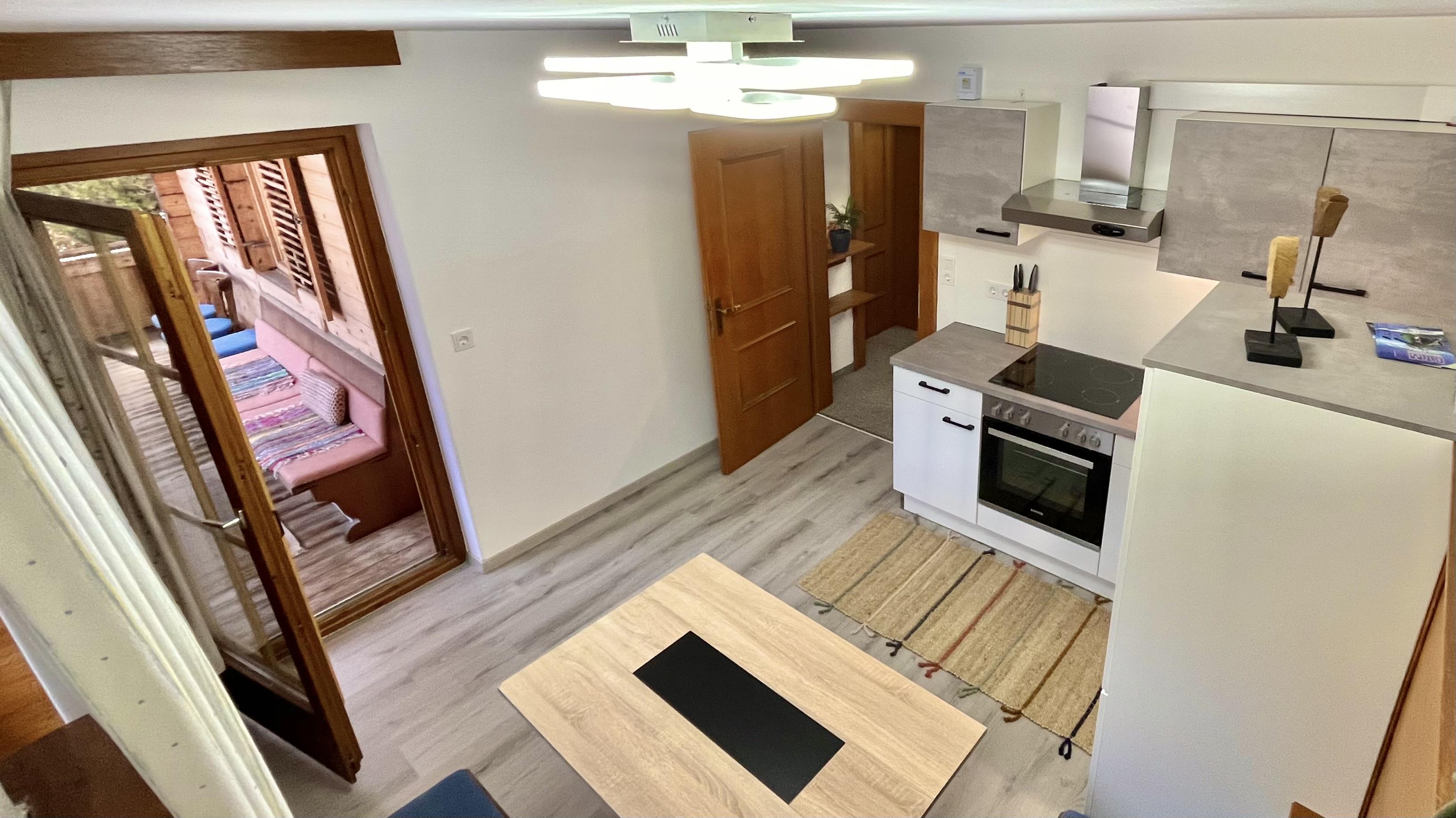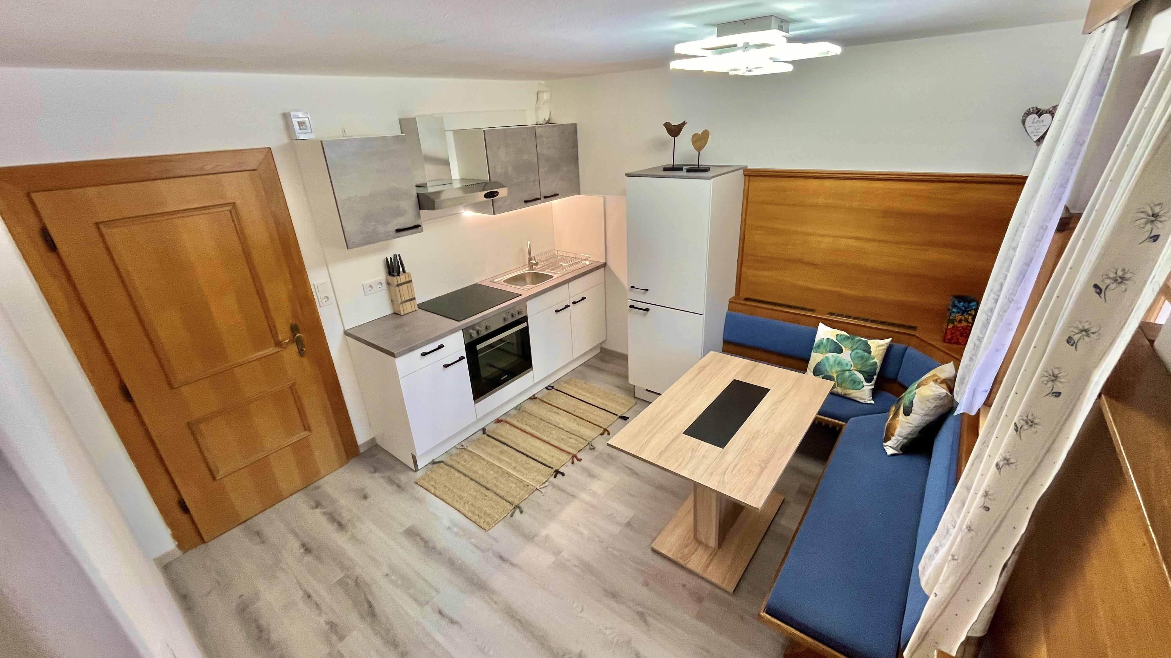 In der modernen und neu renovierten Küche findet man alles was man zum Kochen und für gemütliche Abende braucht: E-Herd/Backrohr, Kühlschrank, Wasserkocher, Toaster, Nespresso Kaffeemaschine, Eckbank/Küchentisch, direkter Zugang zum Balkon. Das