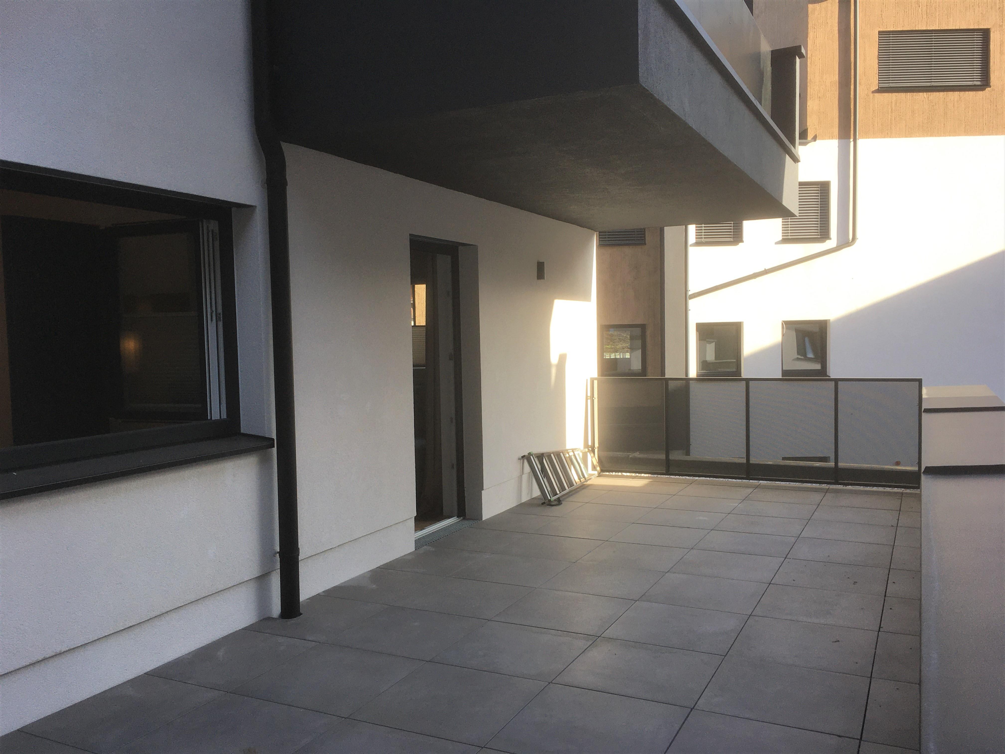 Sehr große, sonnige Terrasse ca. 30m² mit Gartenmöbel und Sonnenliegen.