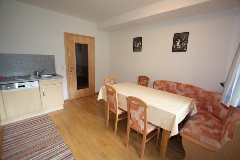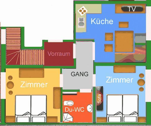 5-6er-Ferienwohnung Nr. 3: 60 m², Lage im 2. Obergeschoss, mit geräumiger Wohnküche mit Sat-TV, gepolsterter Sitzecke mit Tisch, Stühlen und Platz für bis zu 8-10 Personen (ggf. mit Zusatztisch und Stühlen) Küchenzeile, vollständig eingerichtet, u.a. mit