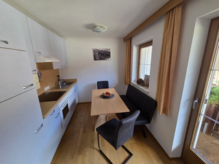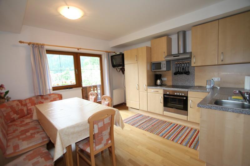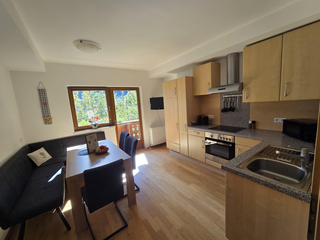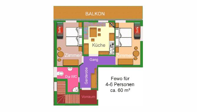 5-6er-Ferienwohnung Nr. 2: 60 m², Lage im 2. Obergeschoss, mit geräumiger Wohnküche mit Balkon, Sat-TV, gepolsterter Sitzecke mit Tisch und Stühlen. Küchenzeile, vollständig eingerichtet, u.a. mit Geschirrspüler, Mikrowelle und 4-Plattenherd mit Backofen.