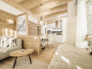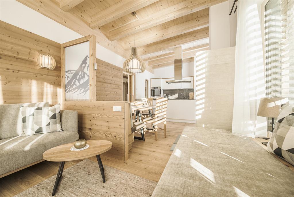 Vorraum mit Garderobe Wohnküche mit Liegesofa, offenem Kamin, voll eingerichteter Küche und Flat-TV Dreibettzimmer mit Bad, WC und Flat-TV Doppelzimmer mit Dusche und Flat-TV 1 zusätzliches WC eigene Sauna mit freiem Blick auf das Bergpanorama Safe, Föhn, Radio, gratis W-Lan Balkon-Terrasse Richtung Süd-Westen die Wohnung befindet sich in der 2. Etage Haustiere auf Anfrage