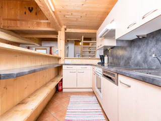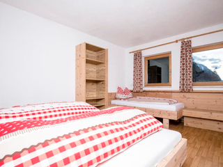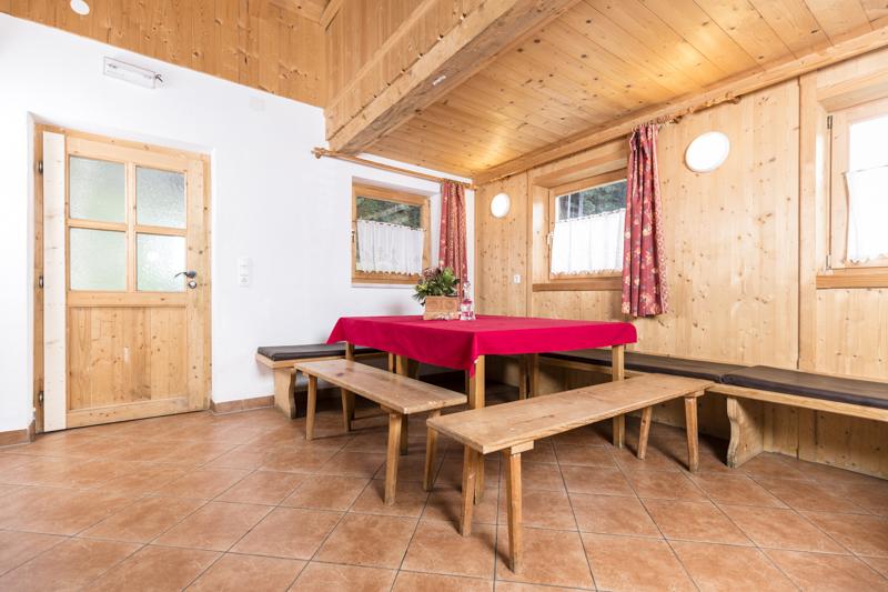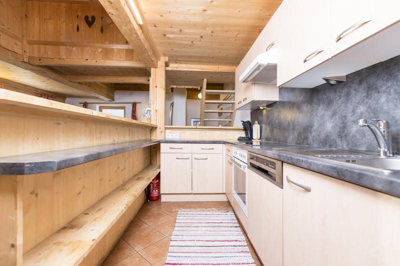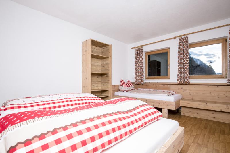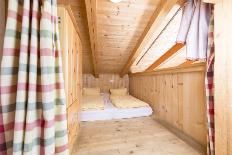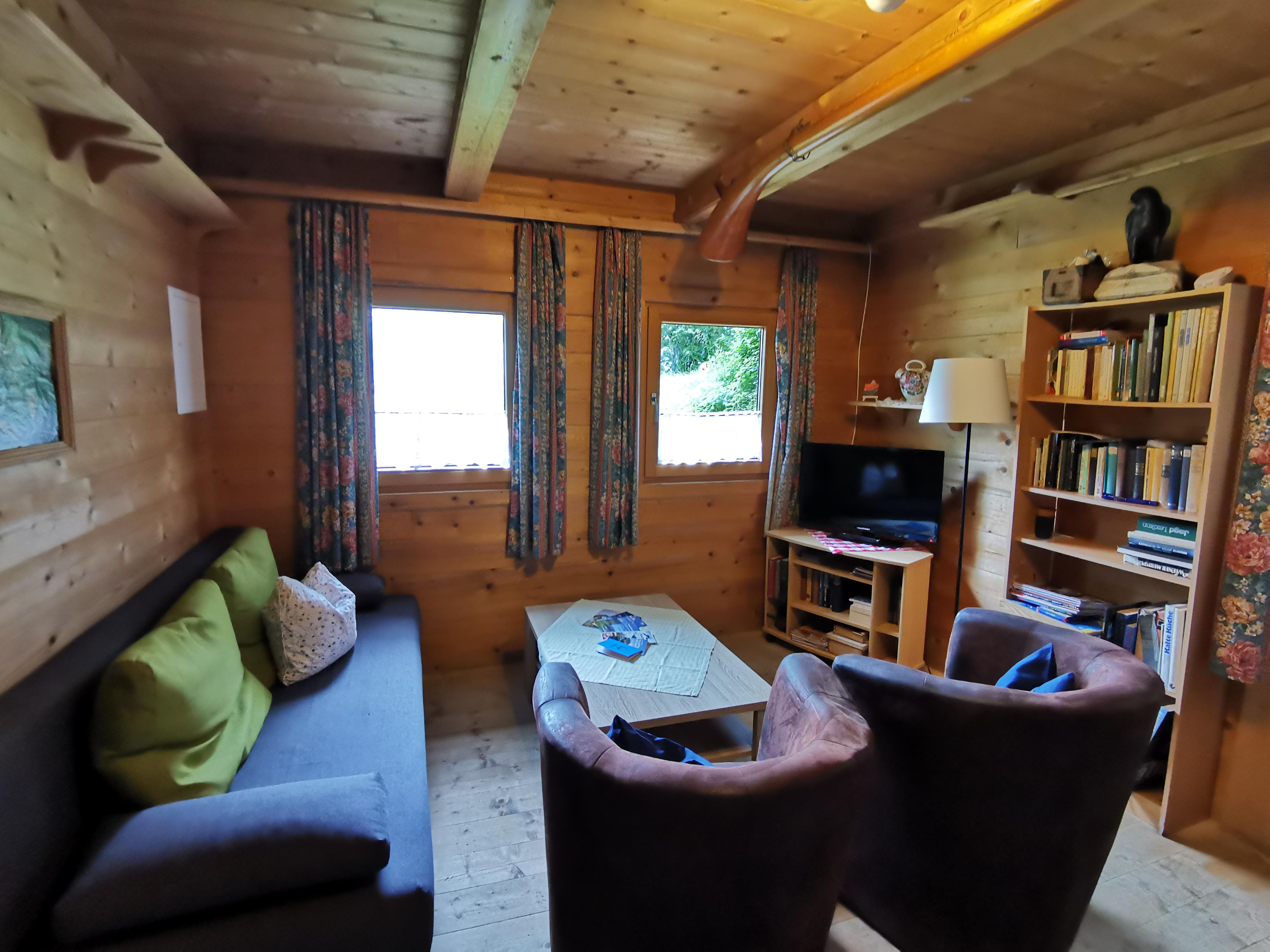 2½-Zimmer-Haus, 3 Etagen, ca. 90 m2 (keine interne Verbindung von Unter- und Erdgeschoß). Untergeschoß: Schlafzimmer mit Doppelbett und Einzelbett. Dusche/WC. Erdgeschoß: Wohnraum mit Sitzcouch, 2 Holztischen mit Bänken, durch Theke abgeteilte, offene