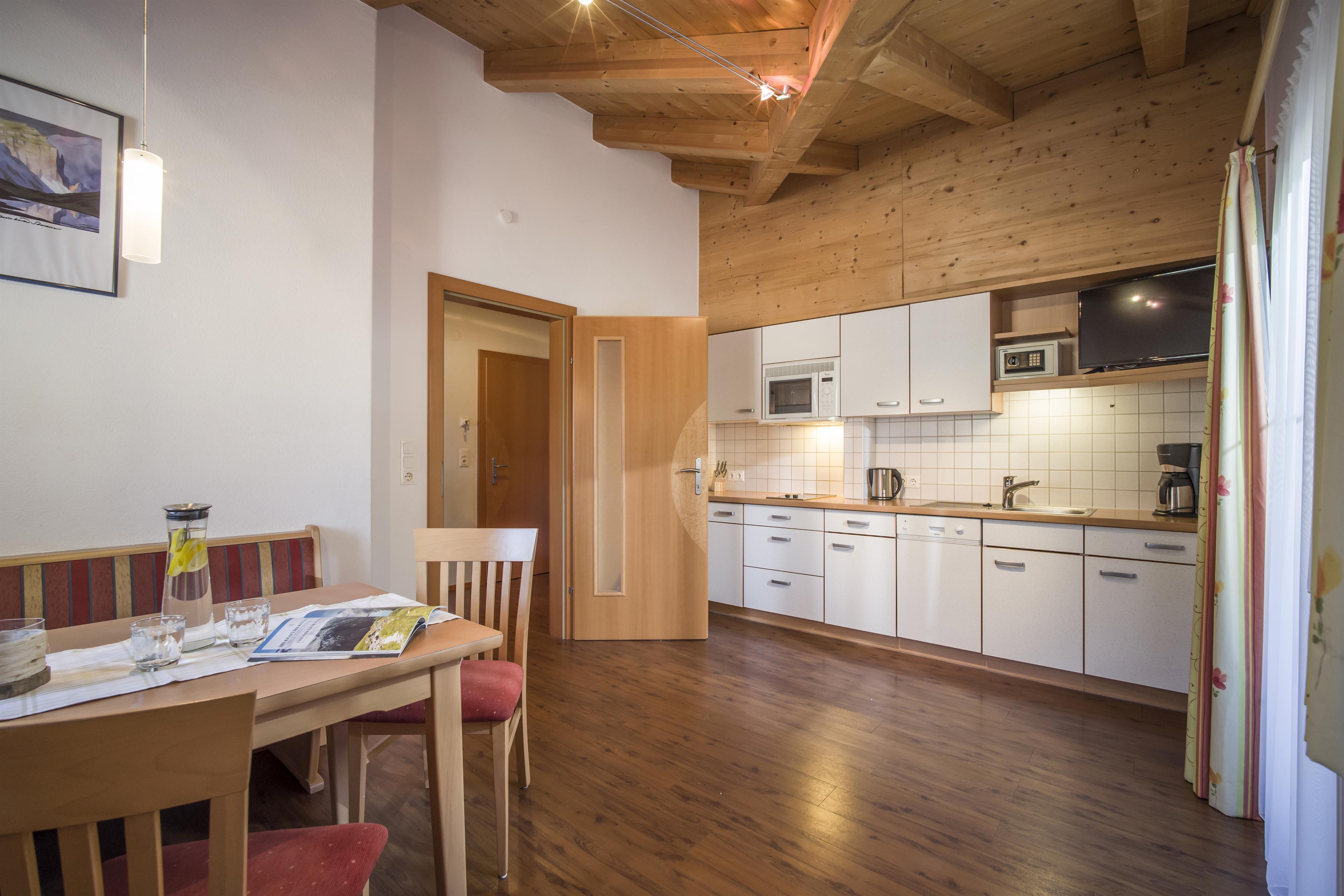 „Der frühe Vogel fängt den Wurm!“ Gemütliches Appartement im 2. Stock mit Sichtdachstuhl, Morgensonne und Loggia mit Bergblick. 1 Schlafzimmer (Doppelbett oder 2 Einzelbetten) Wohnküche mit Essecke & Sofa (Schlafsofa) Bad mit DU/WC/Föhn &