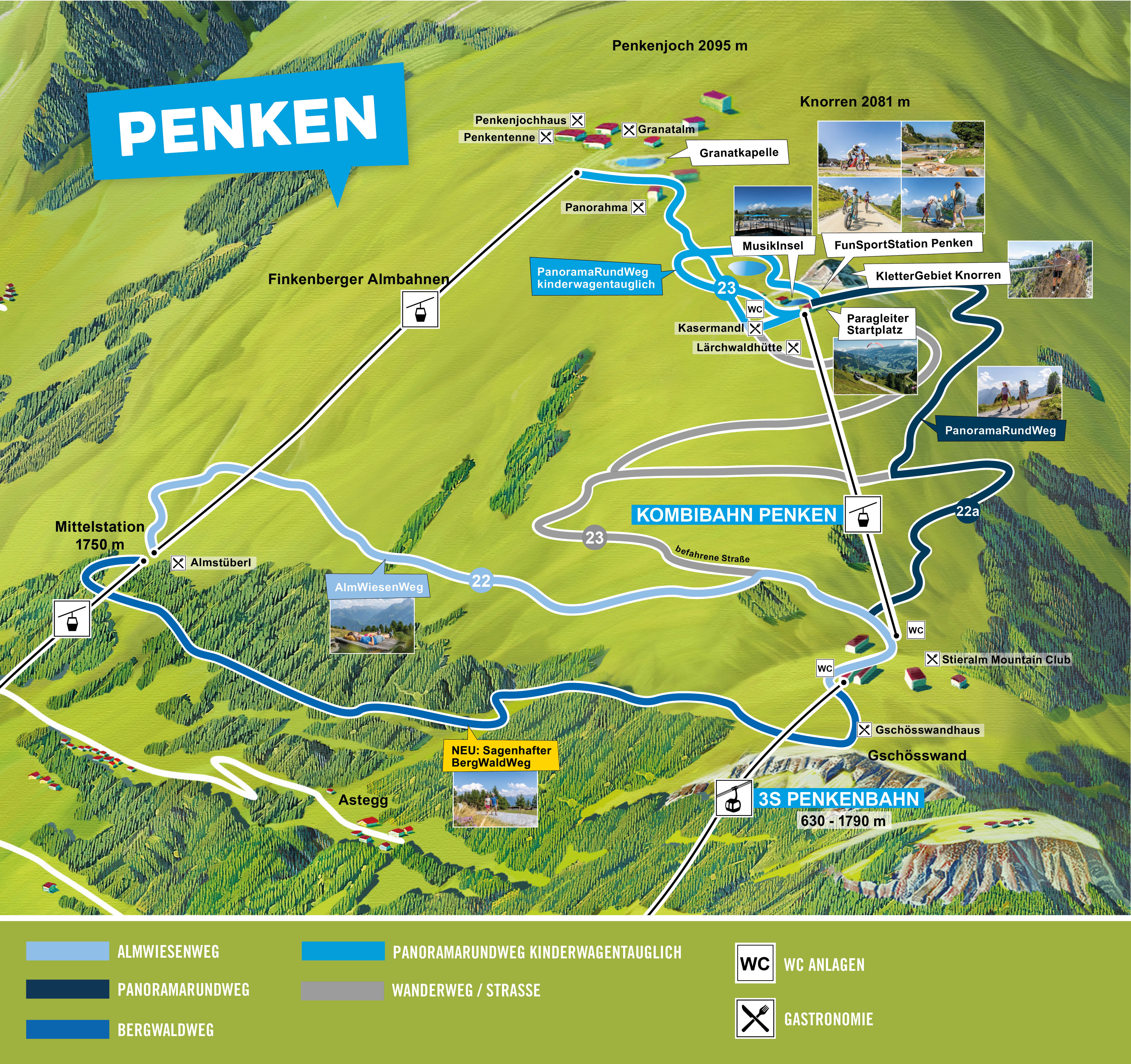 Der kinderwagentaugliche Rundwanderweg am Penken führt von der Bergstation der Kombibahn Penken bis hinauf zum Penkenjoch sowie hinunter zur Bergstation der Penkenbahn. Der Weg führt an zahlreichen actiongeladenen Sportschauplätzen vorbei - so lassen sich zum Beispiel am KnorrenMassiv die wagemutigen Kletterer und an den beiden Paragleit-Startplätzen die wahren Adrenalinjunkies beobachten. Verschiedene Aussichtsstationen bieten zudem die Möglichkeit einen detaillierten Blick auf die Bergwelt zu werfen. Die Wanderung dauert hin und retour ca. 2 h.