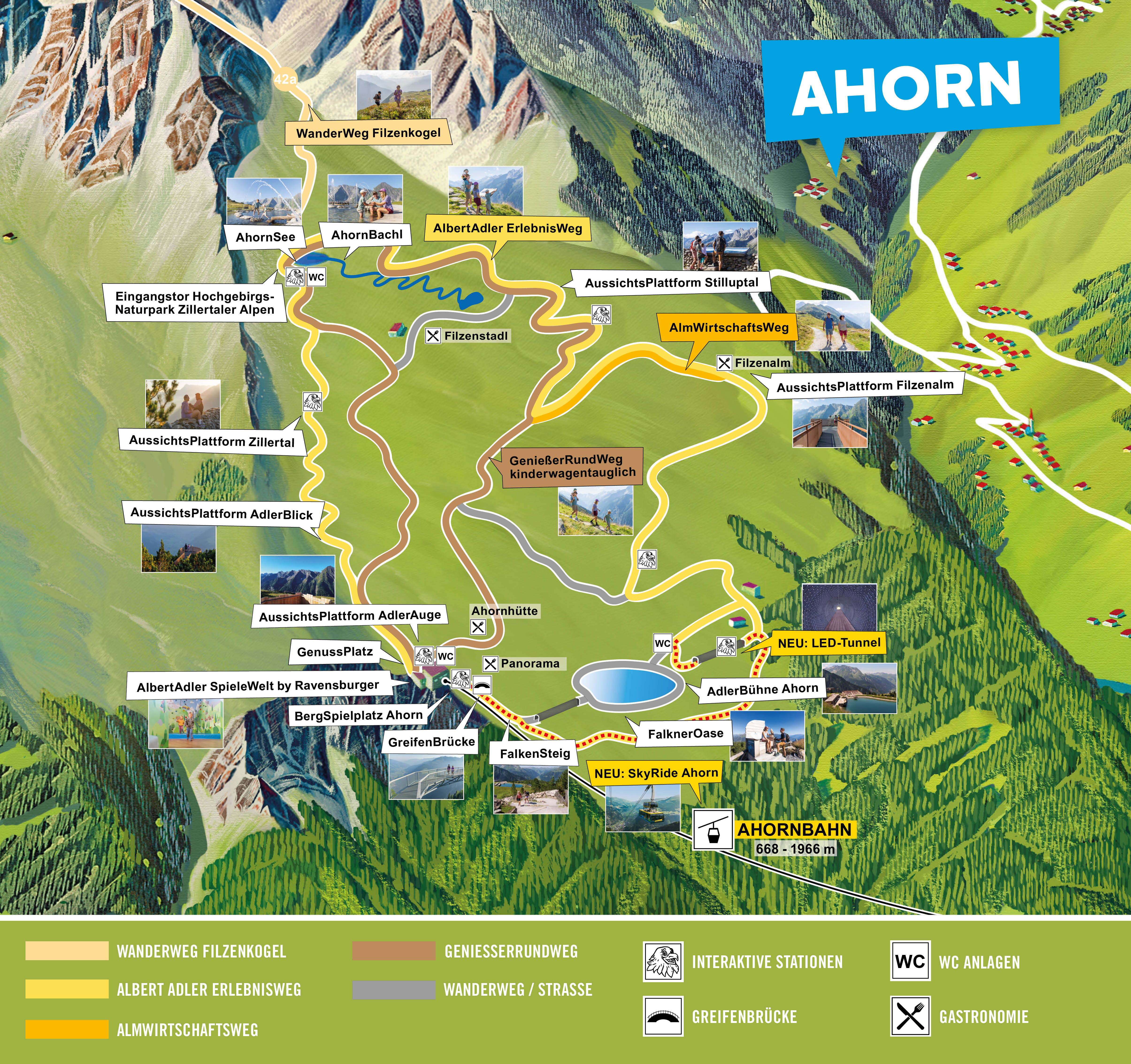 Interaktives Wandern am Ahorn. Familienzeit mit Kindern im Zillertal wird jetzt zum echten Abenteuer: Der brandneue AlbertAdler ErlebnisWeg auf dem AhornPlateau in Mayrhofen verbindet spannende Naturerlebnisse mit interaktiven Stationen – ideal für Familien, Schulklassen und Entdecker jeden Alters. Begib dich gemeinsam mit unserem Maskottchen AlbertAdler auf eine fantasievolle Reise durch die Geschichte „Albert, der Adler und der Kampf um Mayrhofen“. Dein Abenteuer startet bei der spektakulären Aussichtsplattform AdlerAuge mit dem Viscope-Fernrohr, das dir die Tiroler Bergwelt auf faszinierende Weise näherbringt. Unterwegs erwarten dich liebevoll gestaltete, spielerisch-interaktive Stationen, darunter der animierte LED-Tunnel – ein Erlebnis für Kinder und Erwachsene gleichermaßen. Zum Abschluss wartet der sportliche FalkenSteig mit der imposanten, über 70 Meter langen GreifenBrücke – Nervenkitzel mit Panoramablick inklusive. (Gehzeit ca. 2 h)