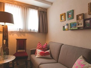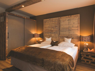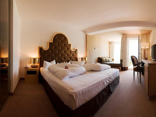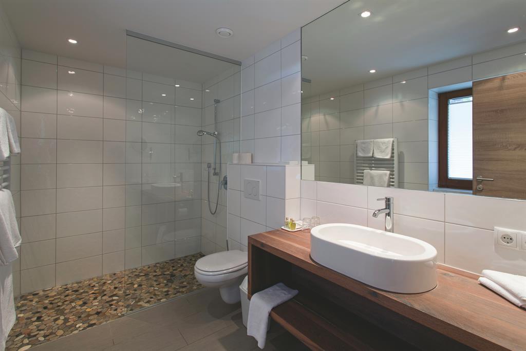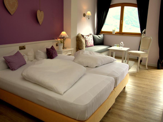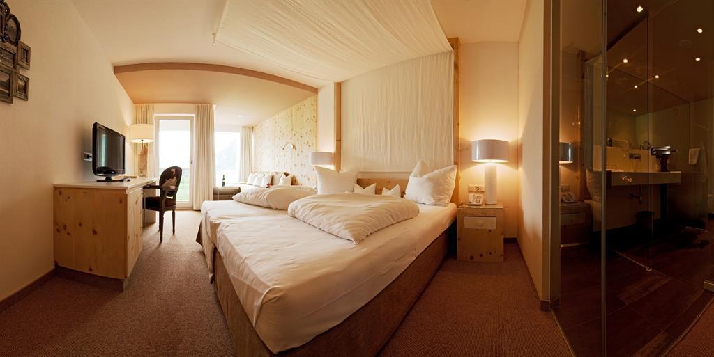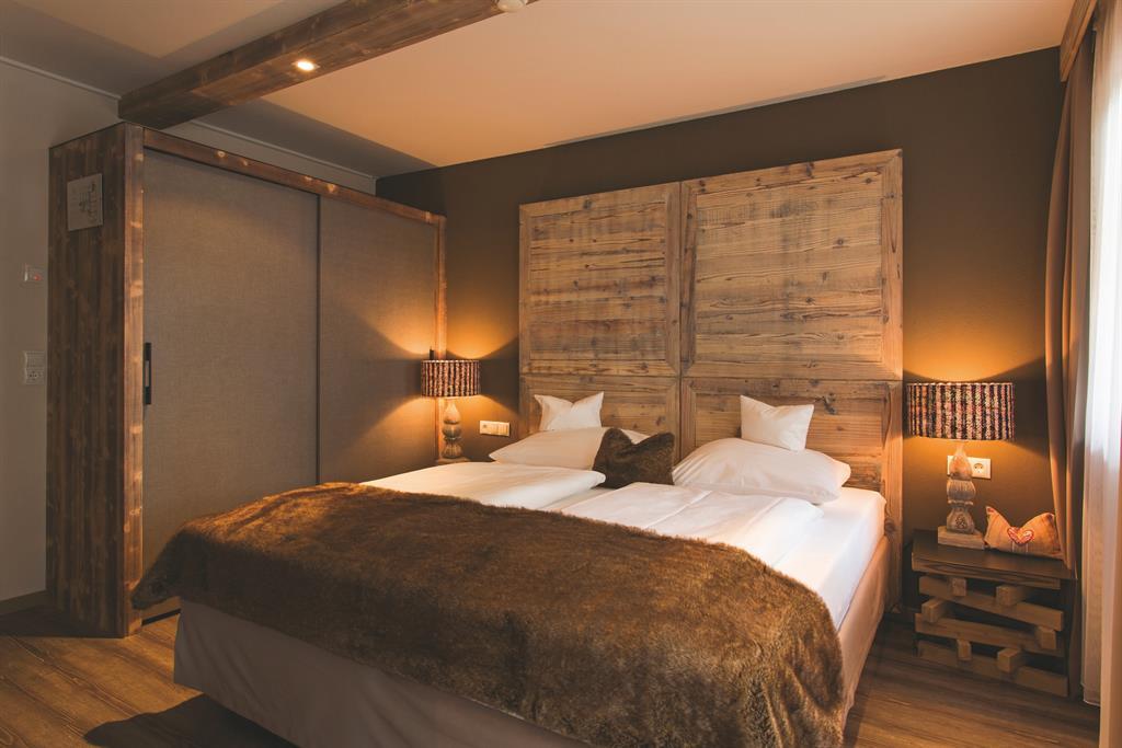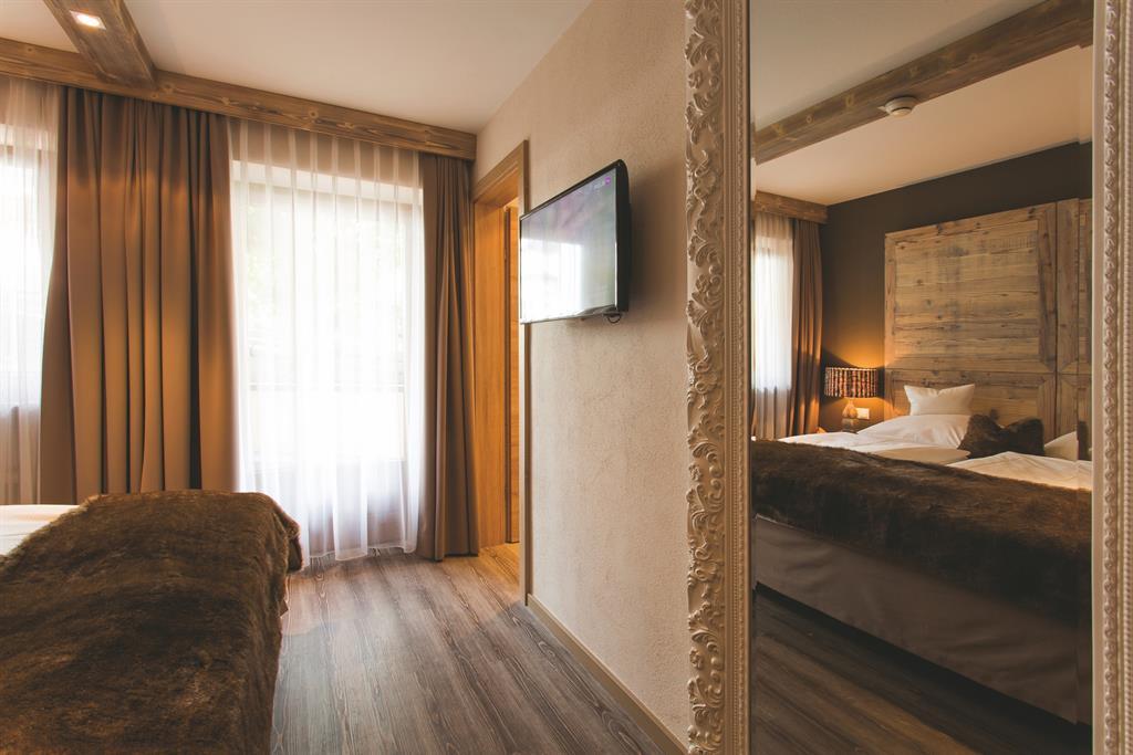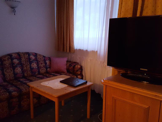Cosy room in Alpine style 31 m² with double bed and TV, separate living room with sofa bed "queen-size" (or king-size double bed), flat screen TV, modern bathroom with shower, balcony with table and chairs, telephone, hairdryer, room safe, bathrobe,