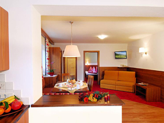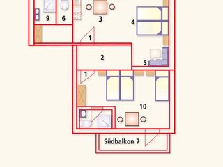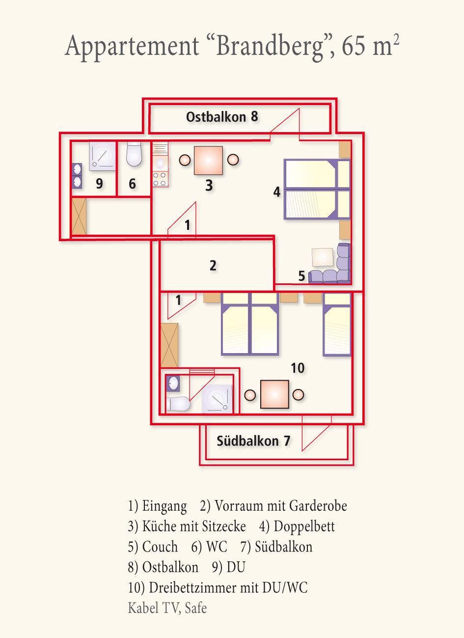 Apartment, 65m², entrance hall with cloakroom, large lounge with south-facing balcony, cable TV, kitchenette with corner seating, 2 double rooms (one of which with 3 beds), 1x shower/WC, 1x shower, 1x WC, safe, telephone, heating, electricity, bed linen,