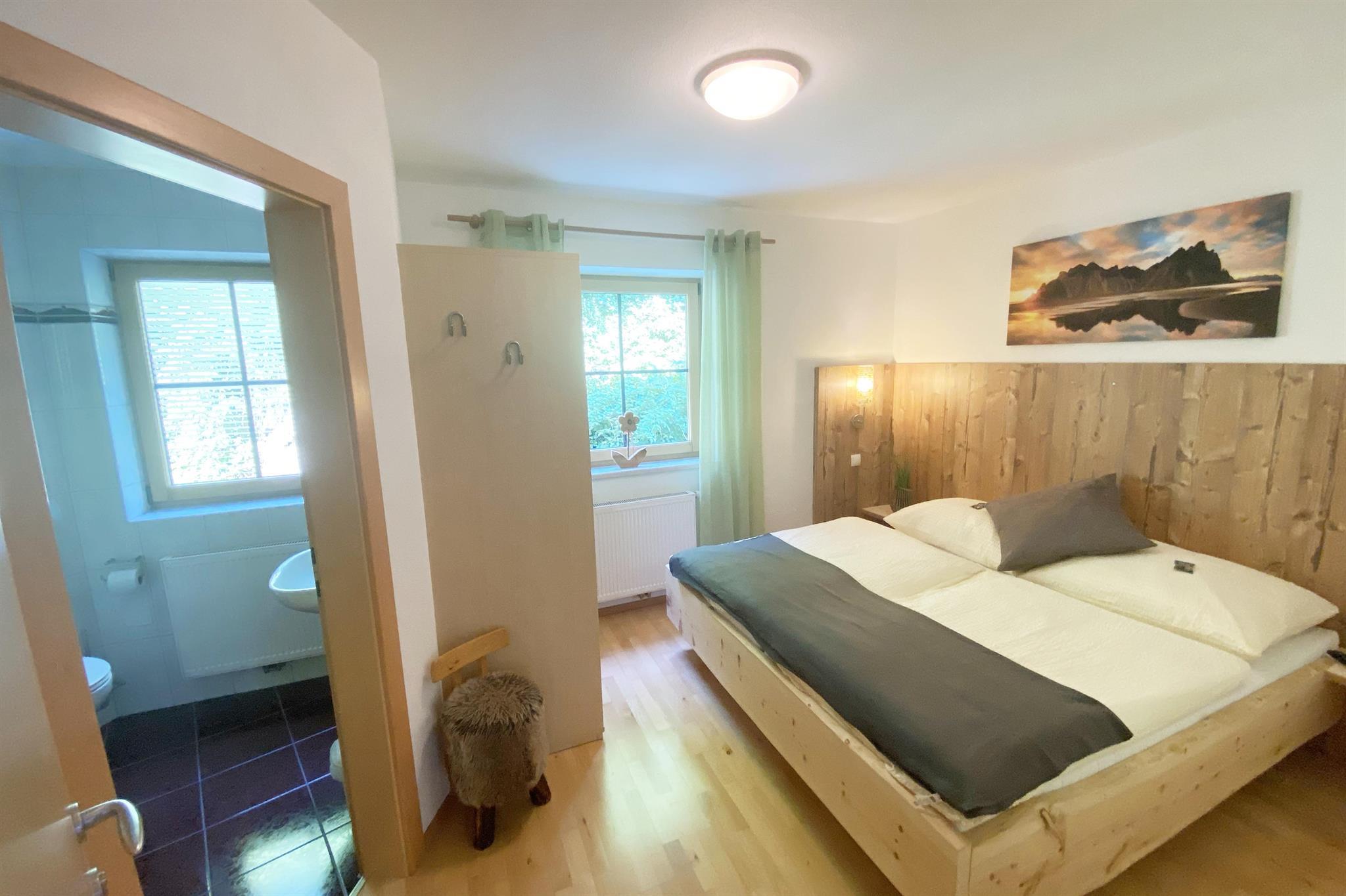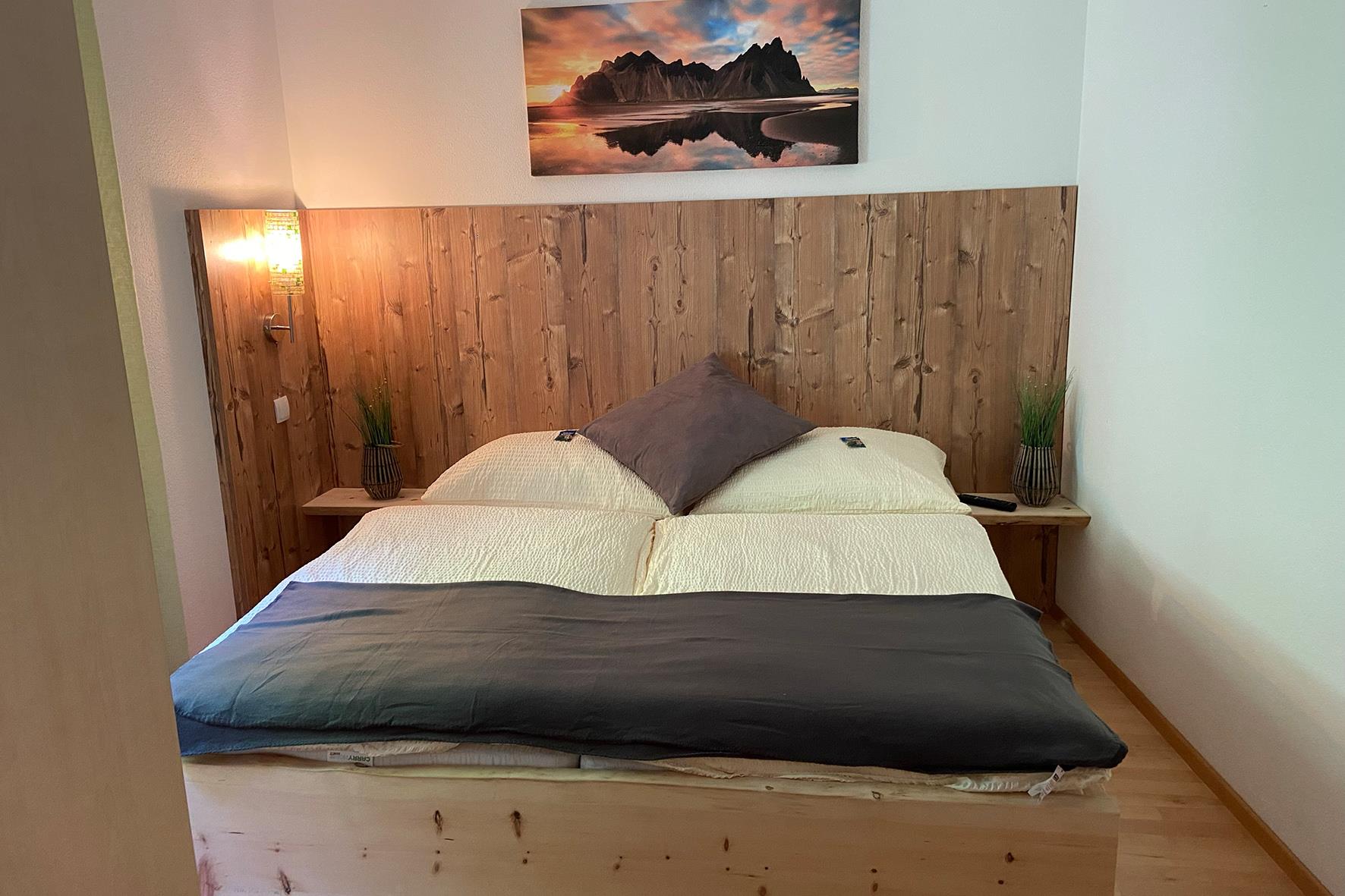 Double room with a cembra pine bed. Very quiete. Without a balcony. Bathroom with a shower, a WC and a window.
