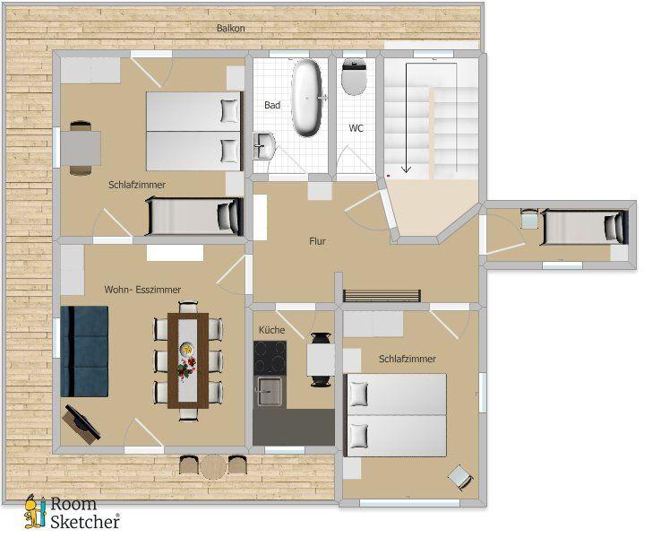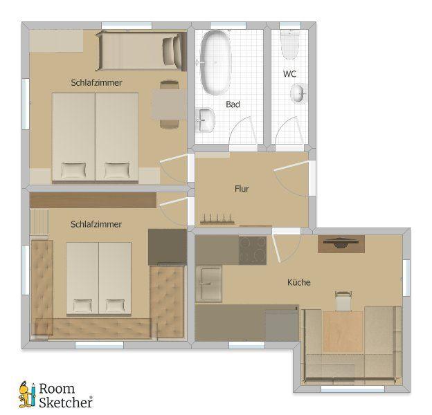 Apartment 1st floor 70 m²: Entrance hall with wardrobe, bathroom (bath and washbasin), sep. WC, kitchen (stove, refrigerator, coffee maker, toaster and kettle), living room with dining table and double sofa bed with TV, from the living room connecting
