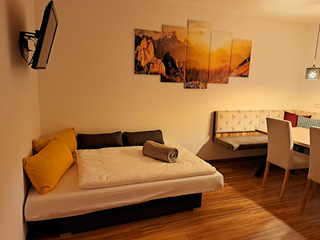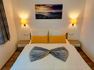 The Sunny Side Apartment offers a spacious, fully equipped living kitchen and a comfortable bedroom with a double bed. The bedroom includes a stylishly furnished bathroom. In the living kitchen, there is a single bed with a high-quality mattress. A