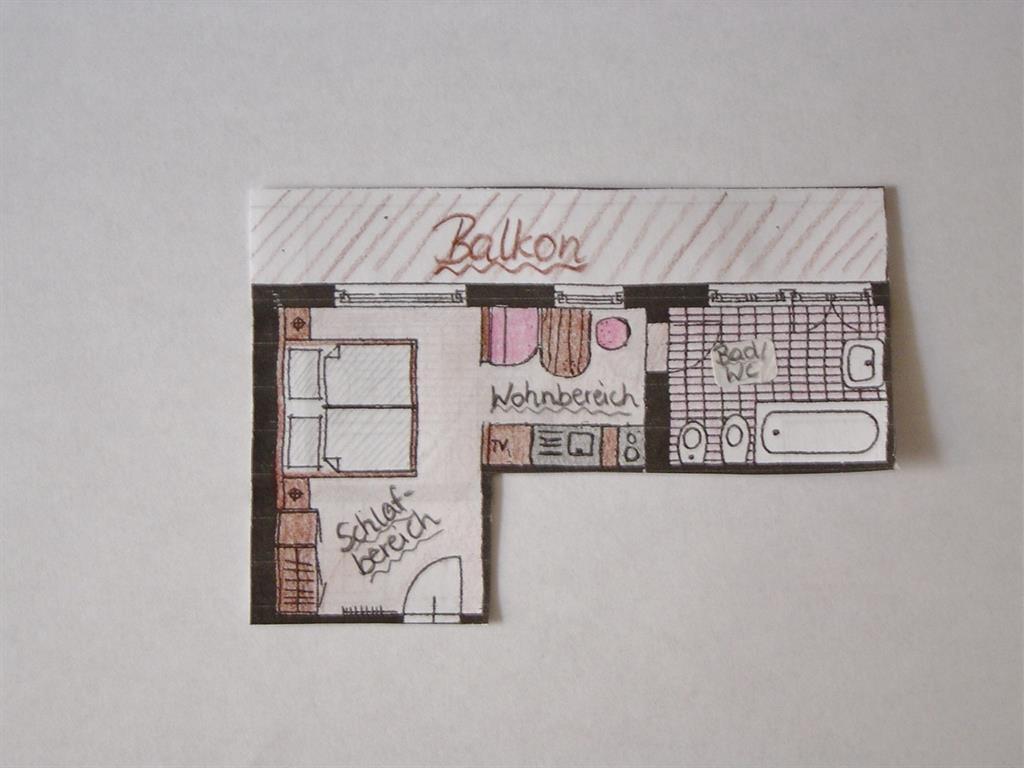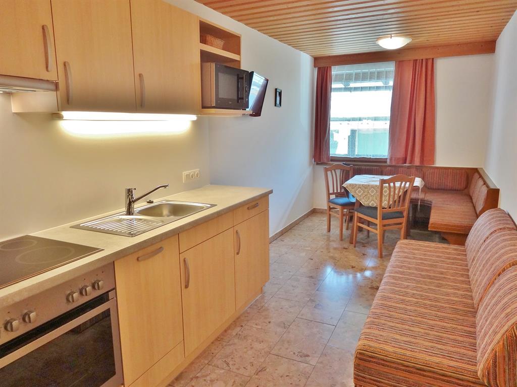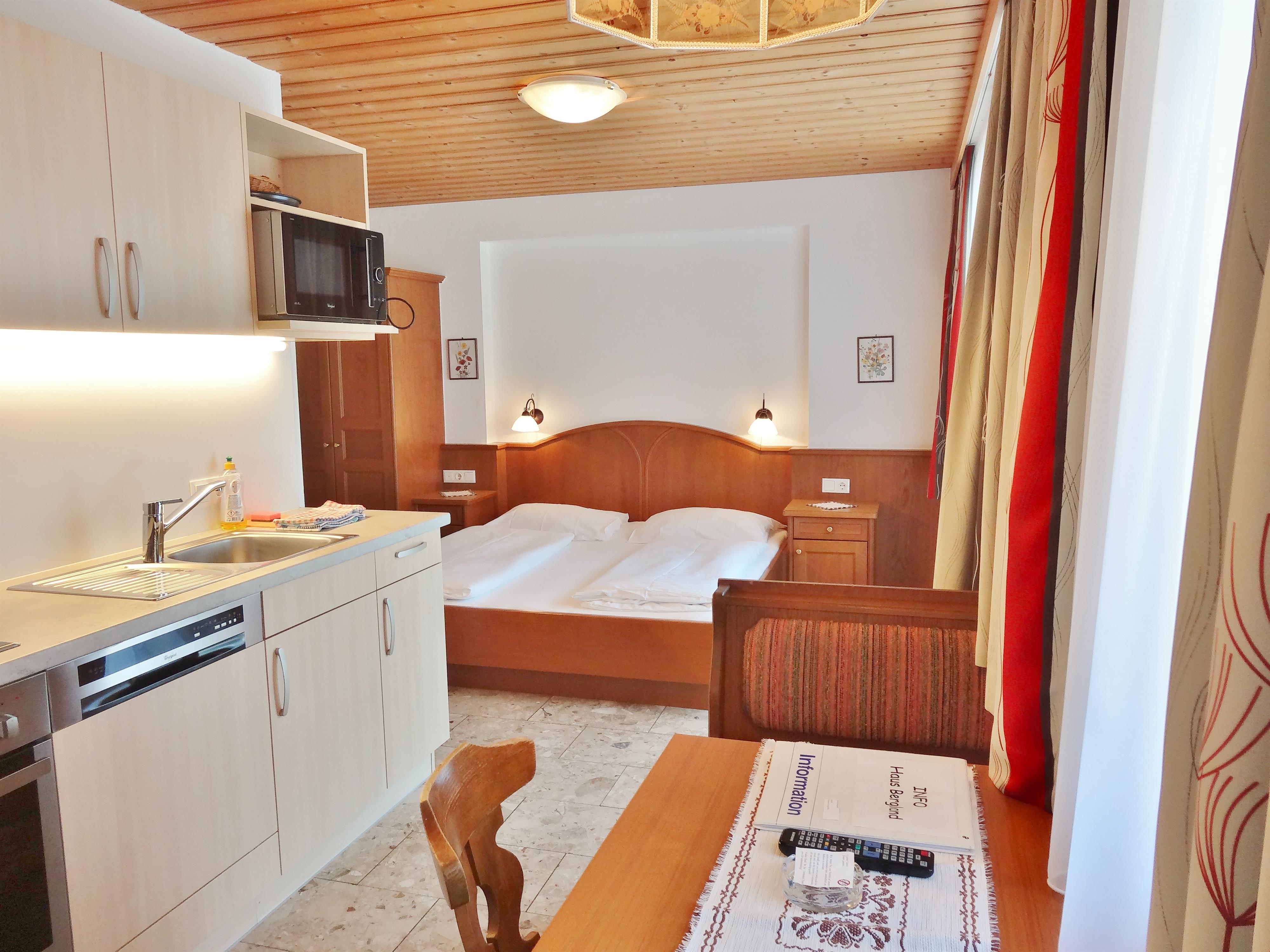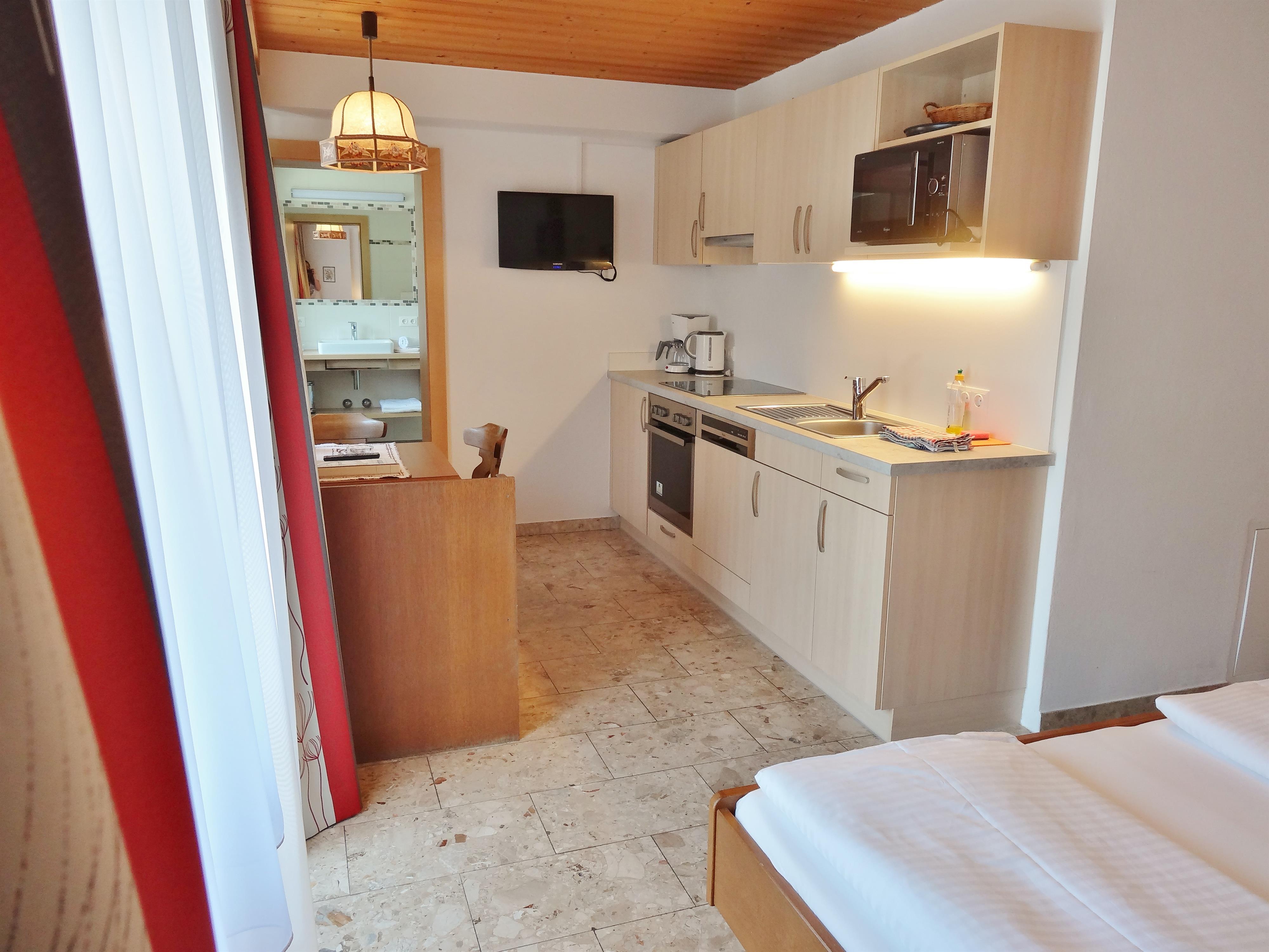 Apartment for 2 persons in Haus Bergland, Hauptstraße 437 consisting of a double room (double bed) with kitchen line (4-fields-electrical-stove, oven, toaster, microwave, dish washer, fridge, coffea maker, water brewer), sitting facility and Sat-TV and a