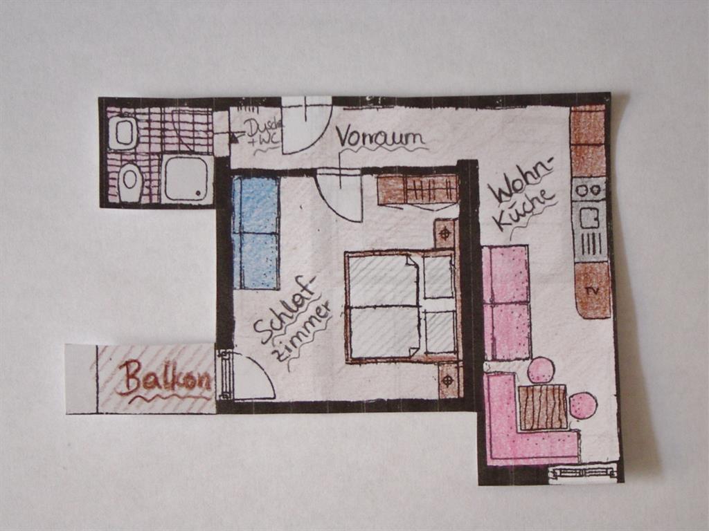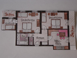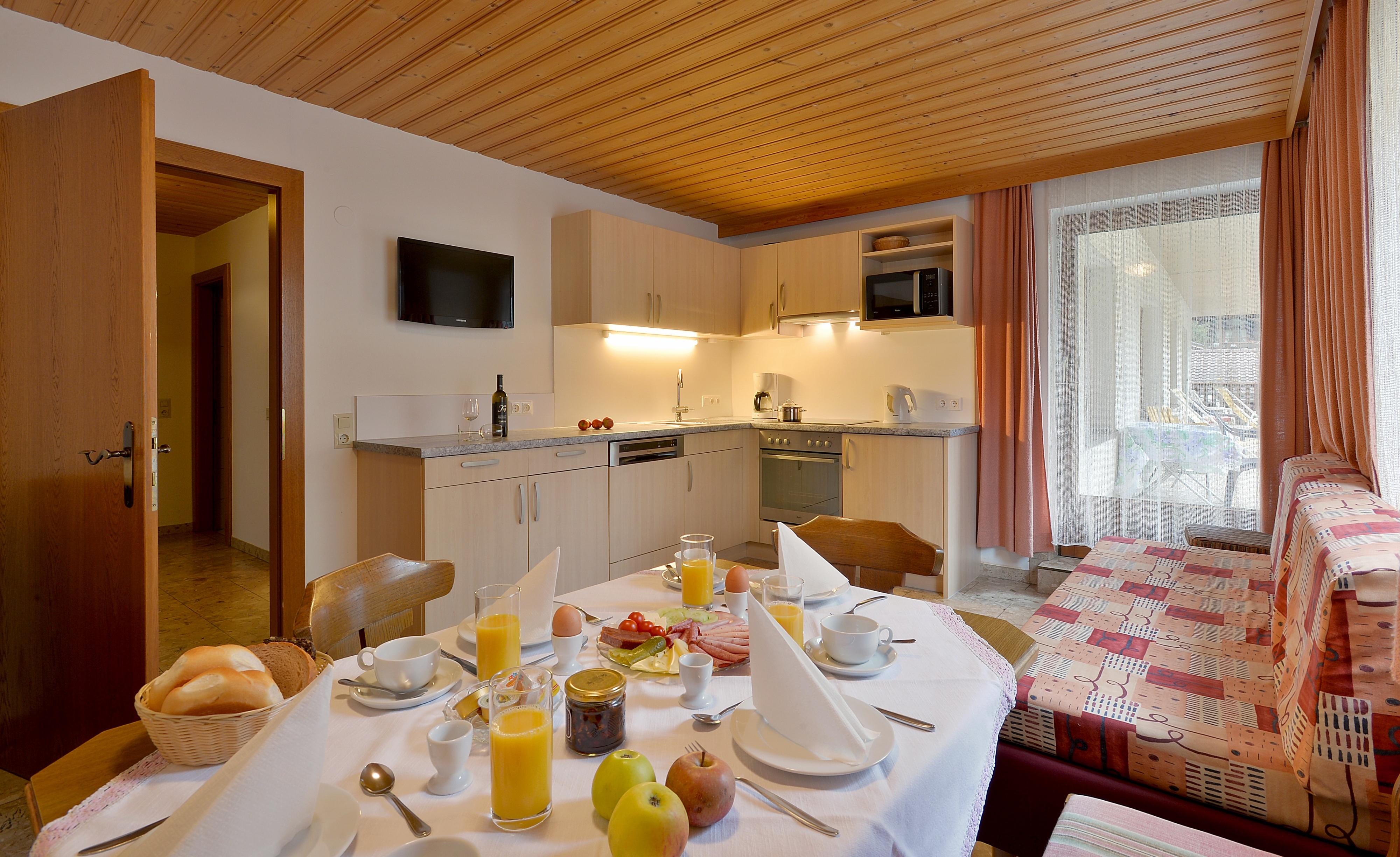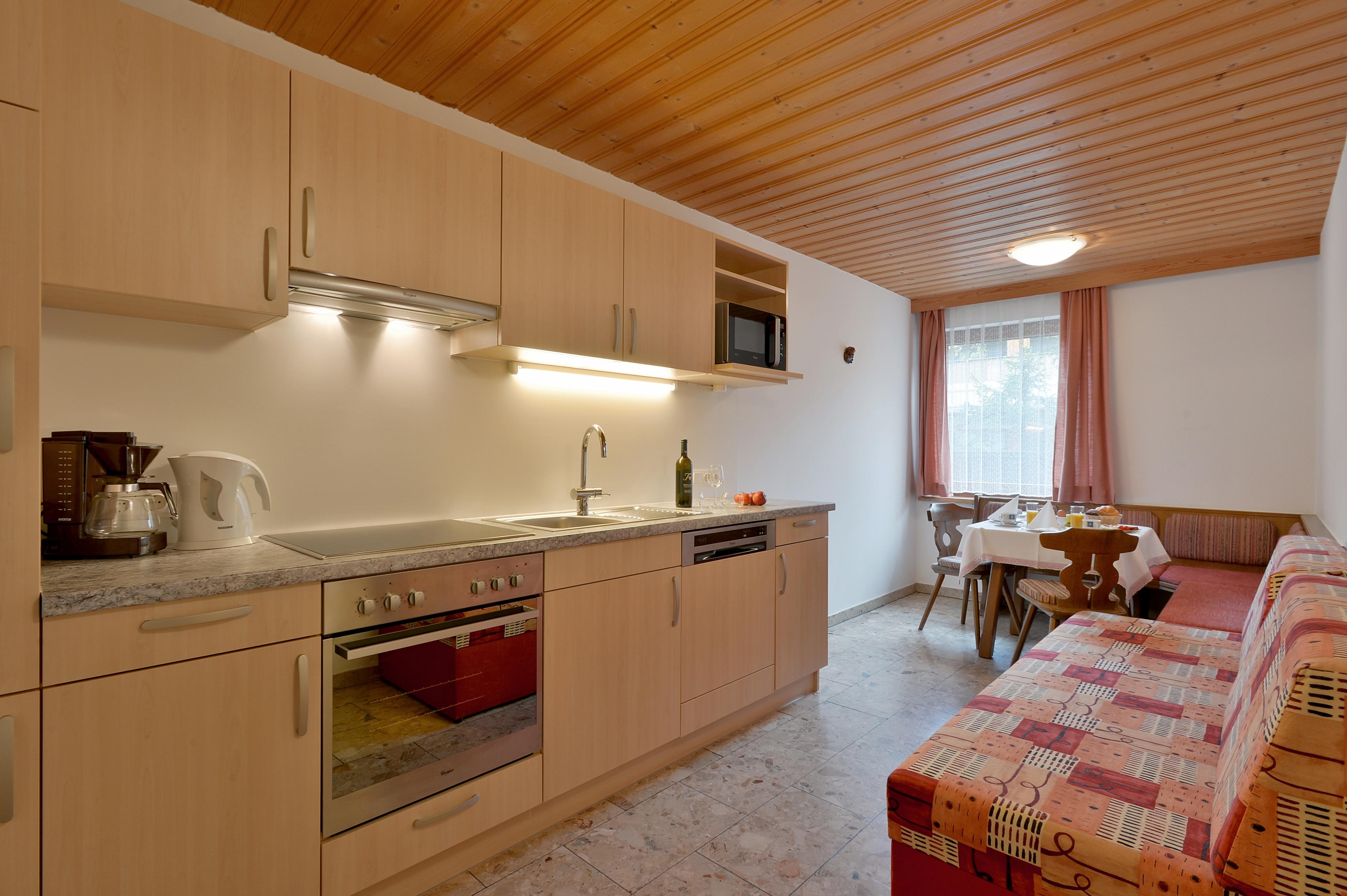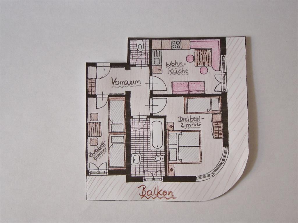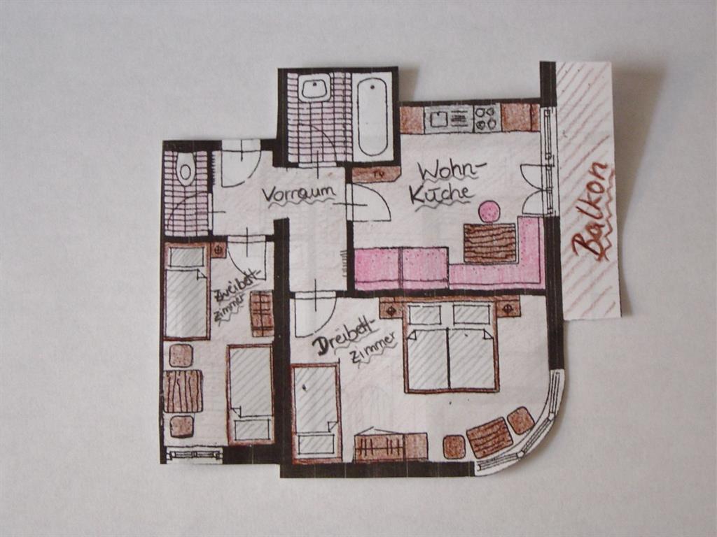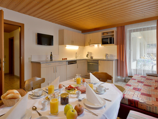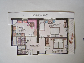 Apartment for up to 5 persons in Haus Bergland, Hauptstraße 437 consisting of 1 three-bedded room (double and single bed), 1 twin room (2 single beds), kitchen (sitting corner, Sat-TV, 4-fields-electrical-stove, oven, microwave, dishwasher, fridge, coffea