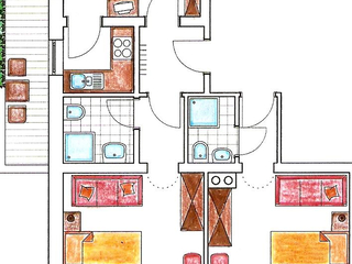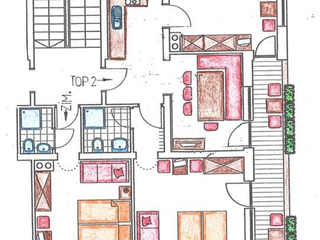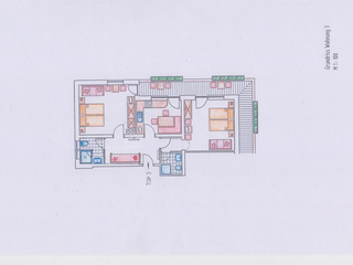 2 bedrooms each with 1 double bed and single bed / shower / WC / hairdryer / towel / bedlinen /SAT-TV, 1 bedroom outside the apartments with shower / WC / SAT-TV / hairdryer / towel / bedlinen (next door to the apartment). Fully equipped kitchen, free