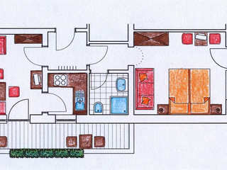 A bedroom with double bed, single bed, SAT-TV, shower/WC/hairdryer/towel/bedlinen. Fully equipped kitchen, living-room with a sofa-bed and wraparound balcony, free W-LAN, our rooms are non-Smoking-rooms.