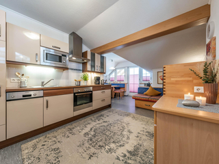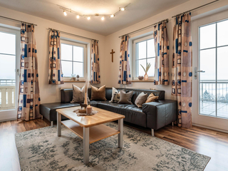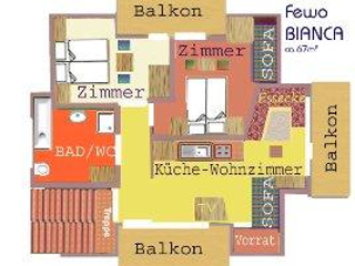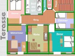 The for 2 up to 4 persons has ca. 67 m² and is equiped with: one double room with a double-bed one double room with an extra sofa one complet equiped kitchen E-cooker, oven, toaster, kettle, fridge, tv, table and table clothes, dishes... radio, internet