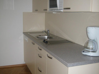 double room with a shower and a toilet with tv dish washer, a coffee machine. a microwave and a fridge, a coffe machine and a own entry