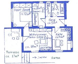 Holiday flat: 62 s.qm., 2 triple roms, 1 single room, livingroom with kitchenette, shower/toilet, balcony, Sat.-TV.
