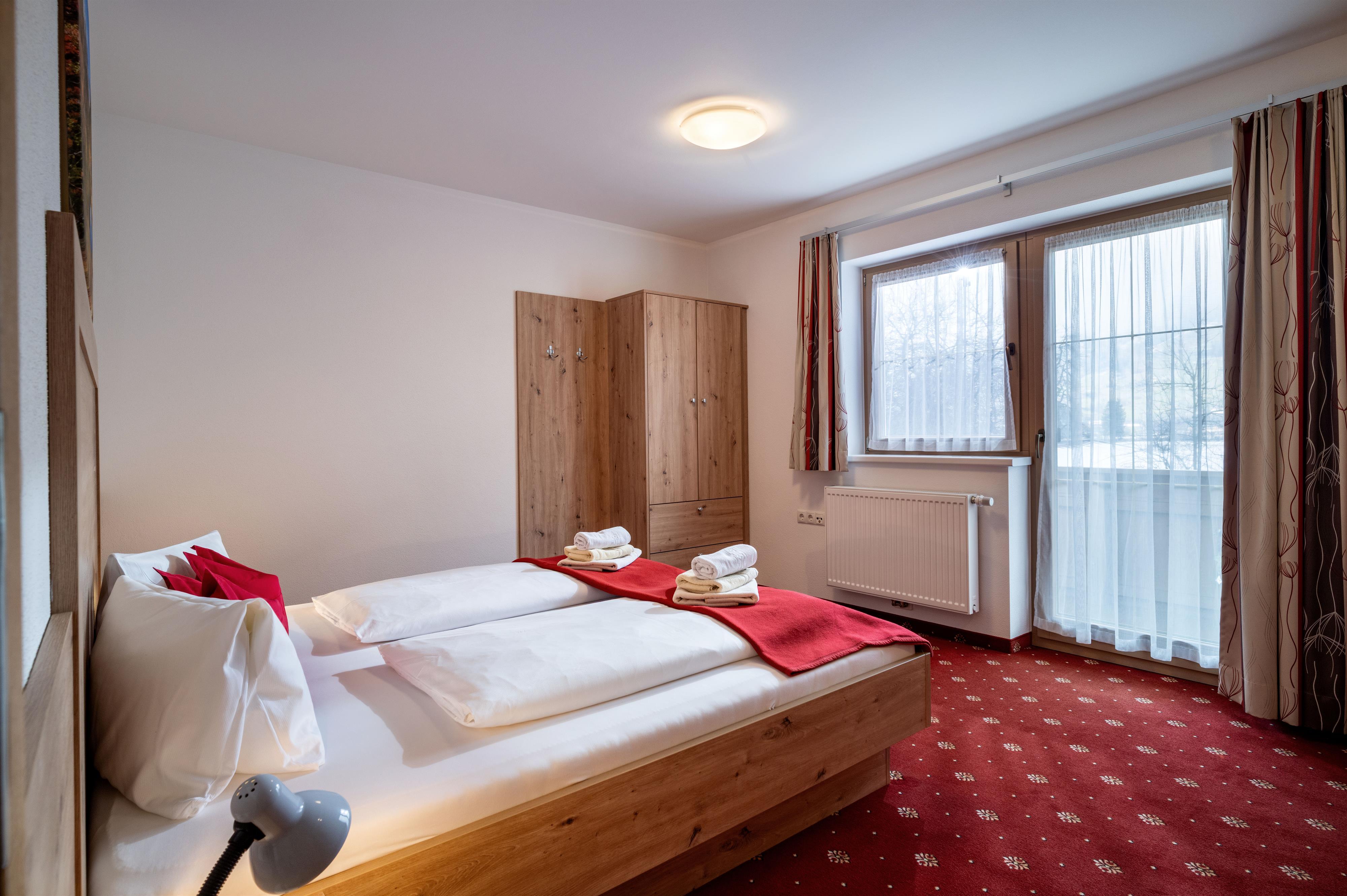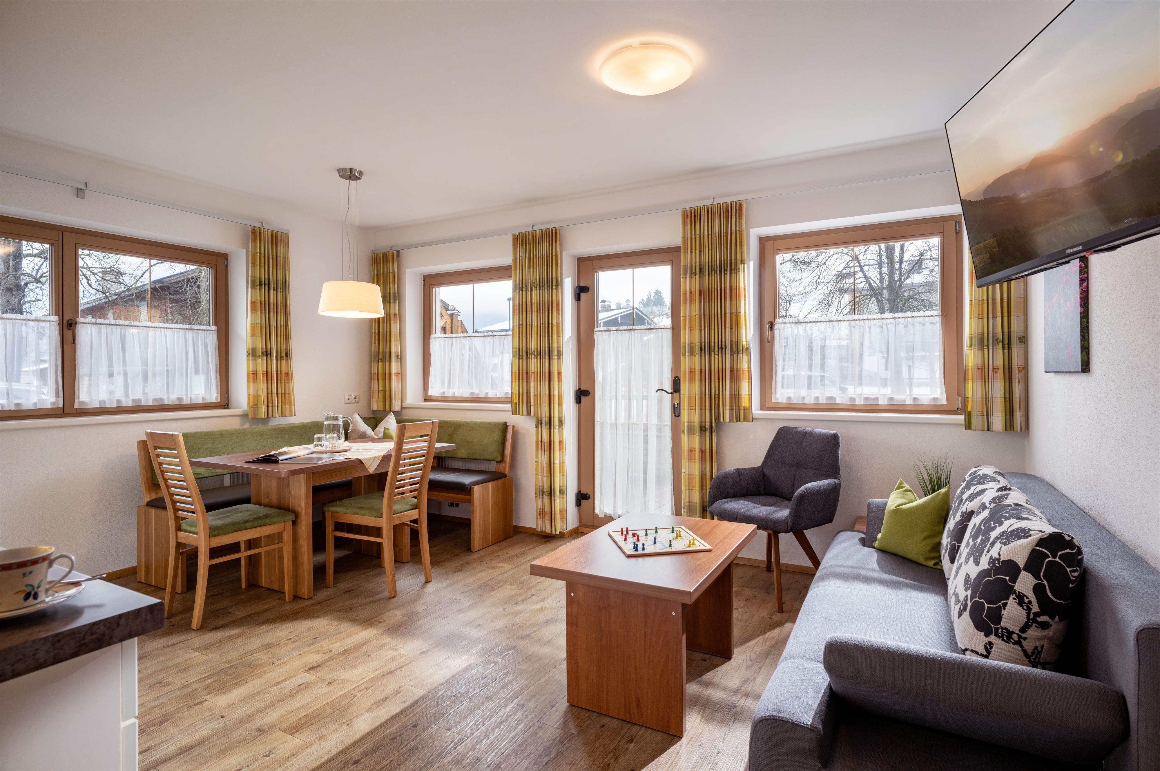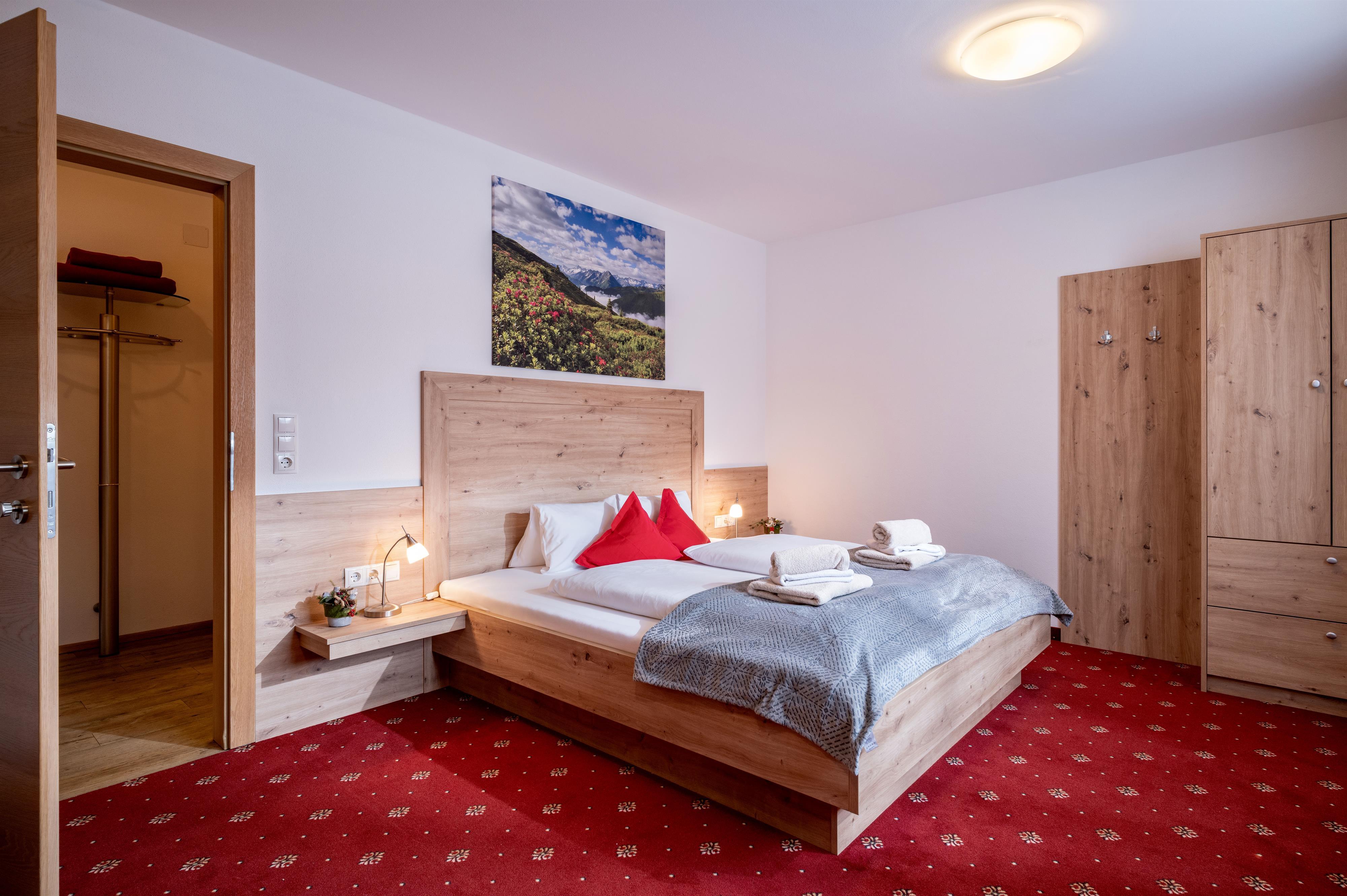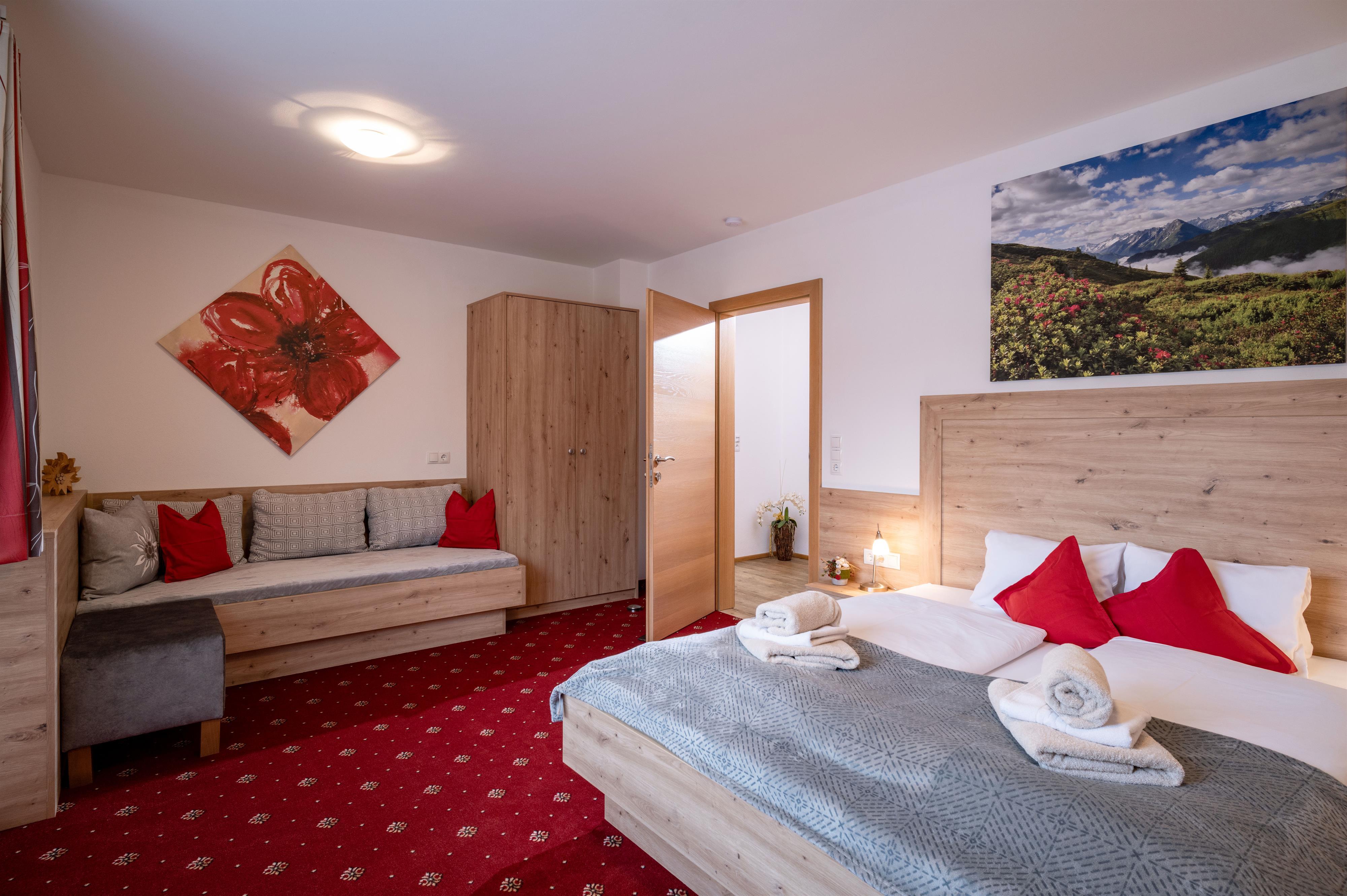 Apartment „Alpenröschen“ 2-3 persons (47m²) Spacious double room with additional bed, shower/WC, cozy living room with top equipped kitchen, large sitting area, couch, TV, W-LAN and terrace. Without catering, bread service on request.