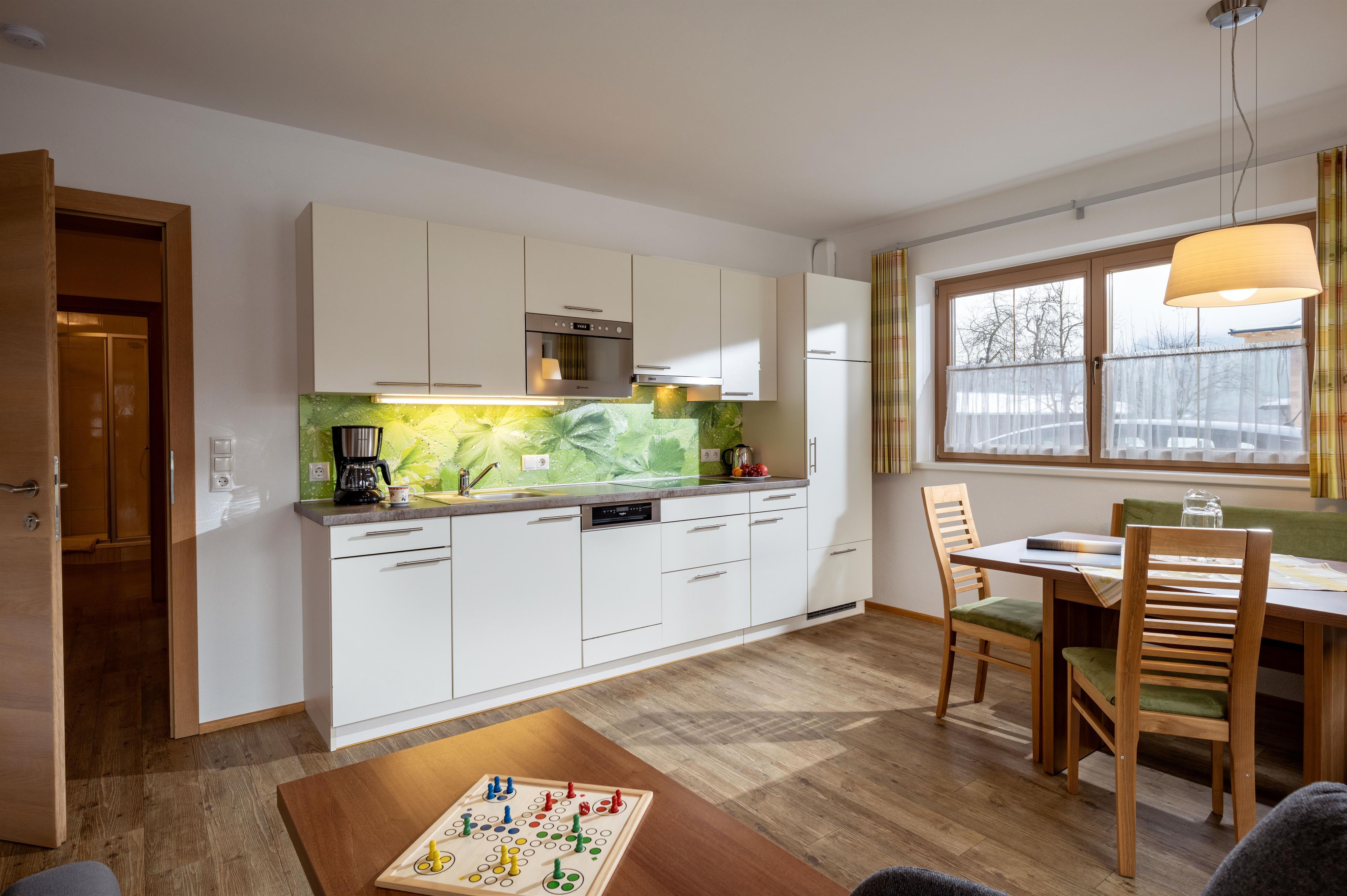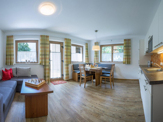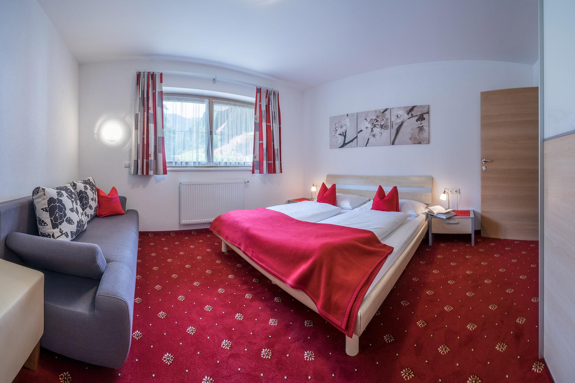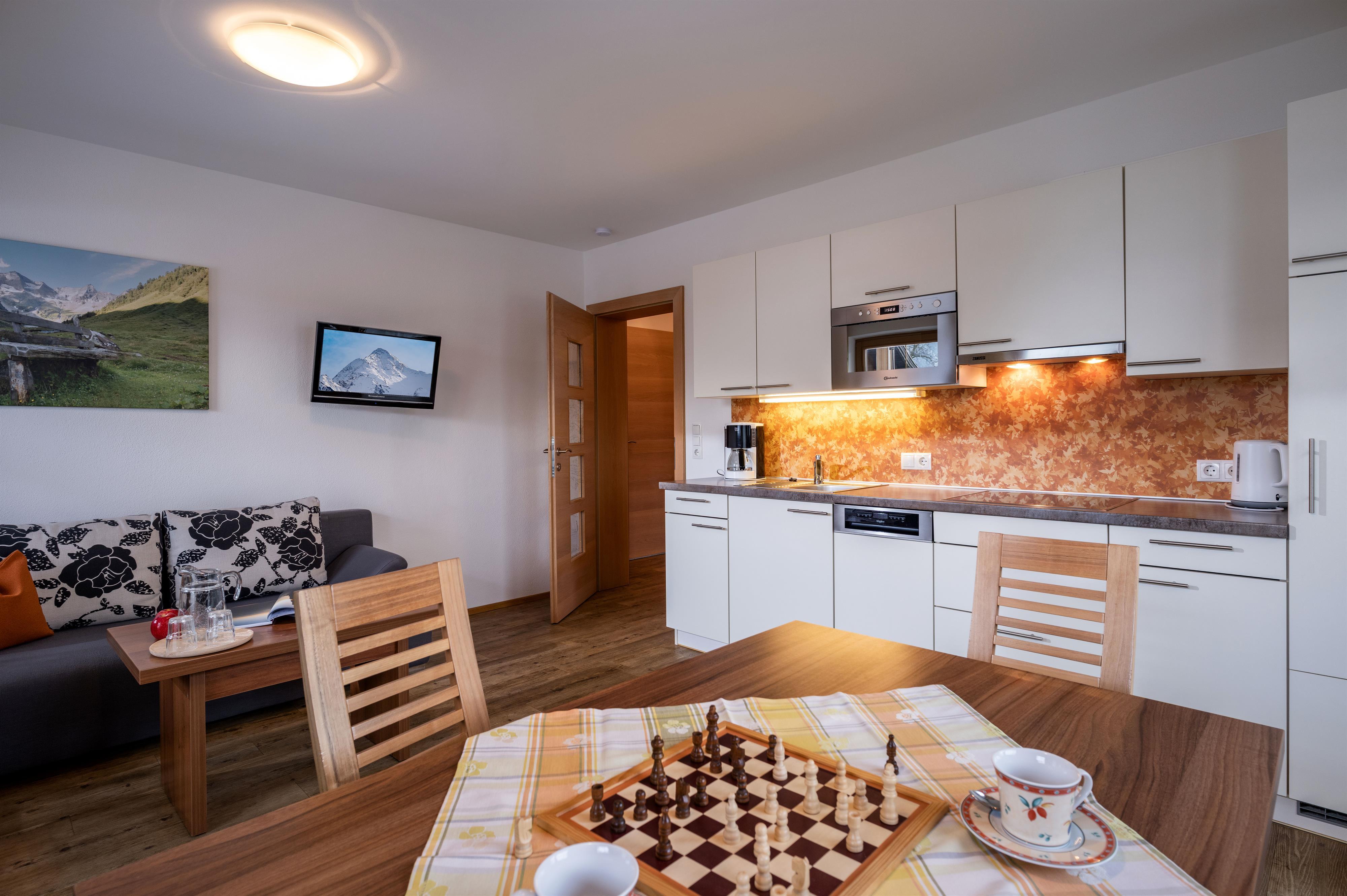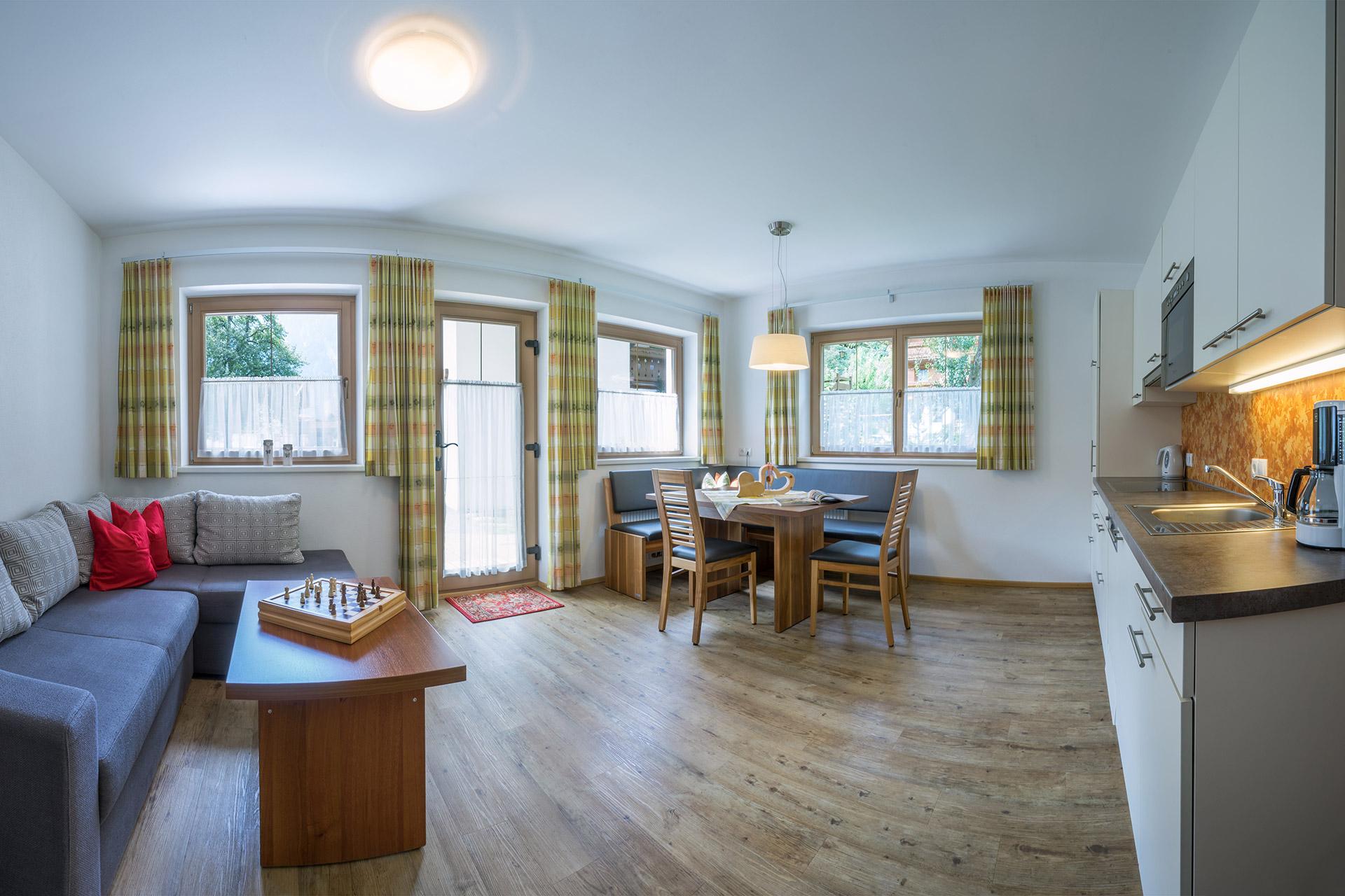 Apartment „Alpenröschen“ 2-3 persons (47m²) Spacious double room with additional bed, shower/WC, cozy living room with top equipped kitchen, large sitting area, couch, TV, W-LAN and terrace. Without catering, bread service on request.